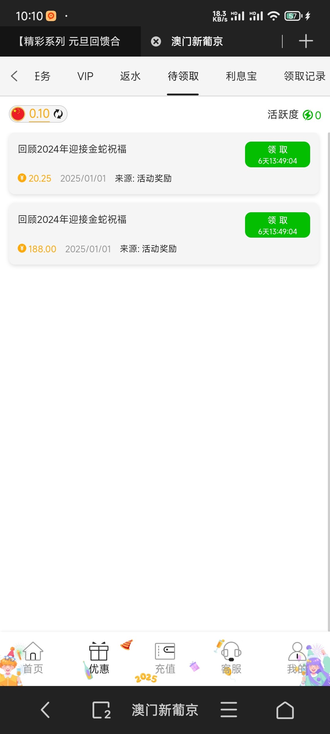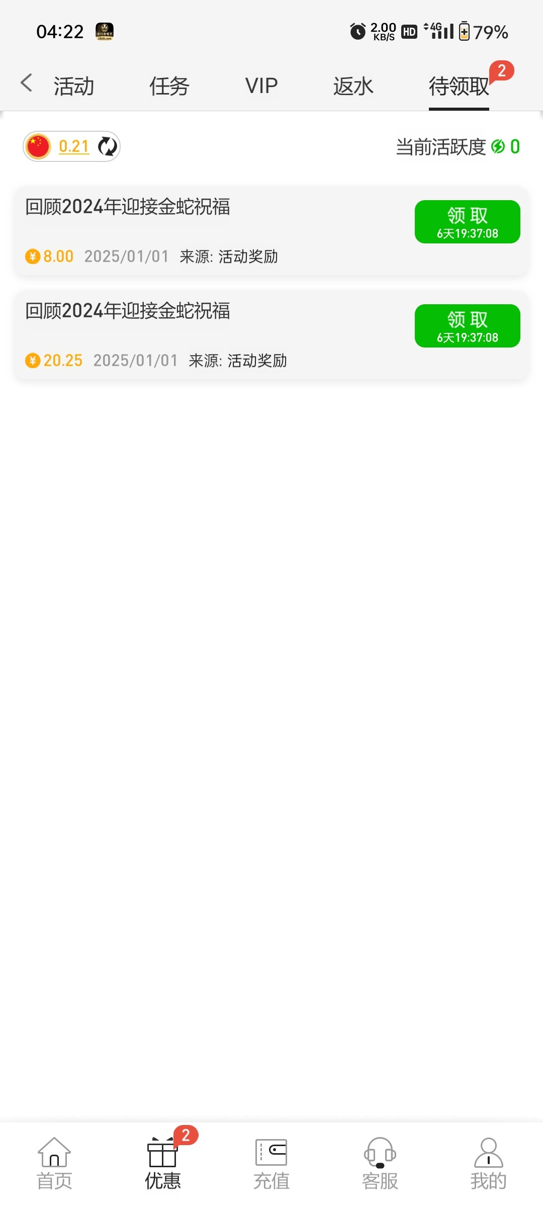 单笔充值100以上才有,我领了8