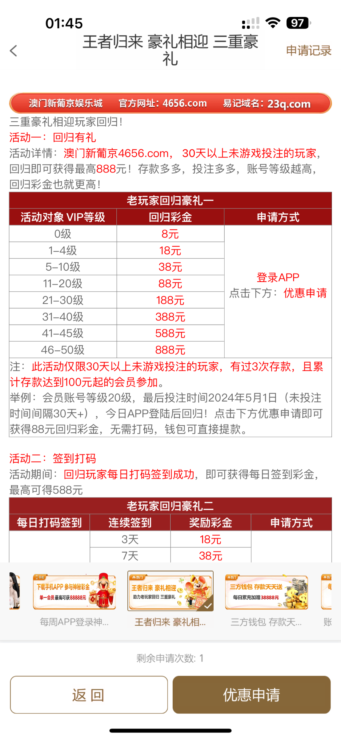 4656历史存款送了,有号充值的记得去领取,没充那么多可以申请这个老用户回归8块,存过100就能申请 4656.com