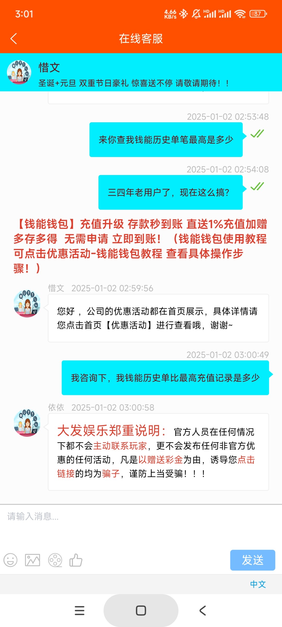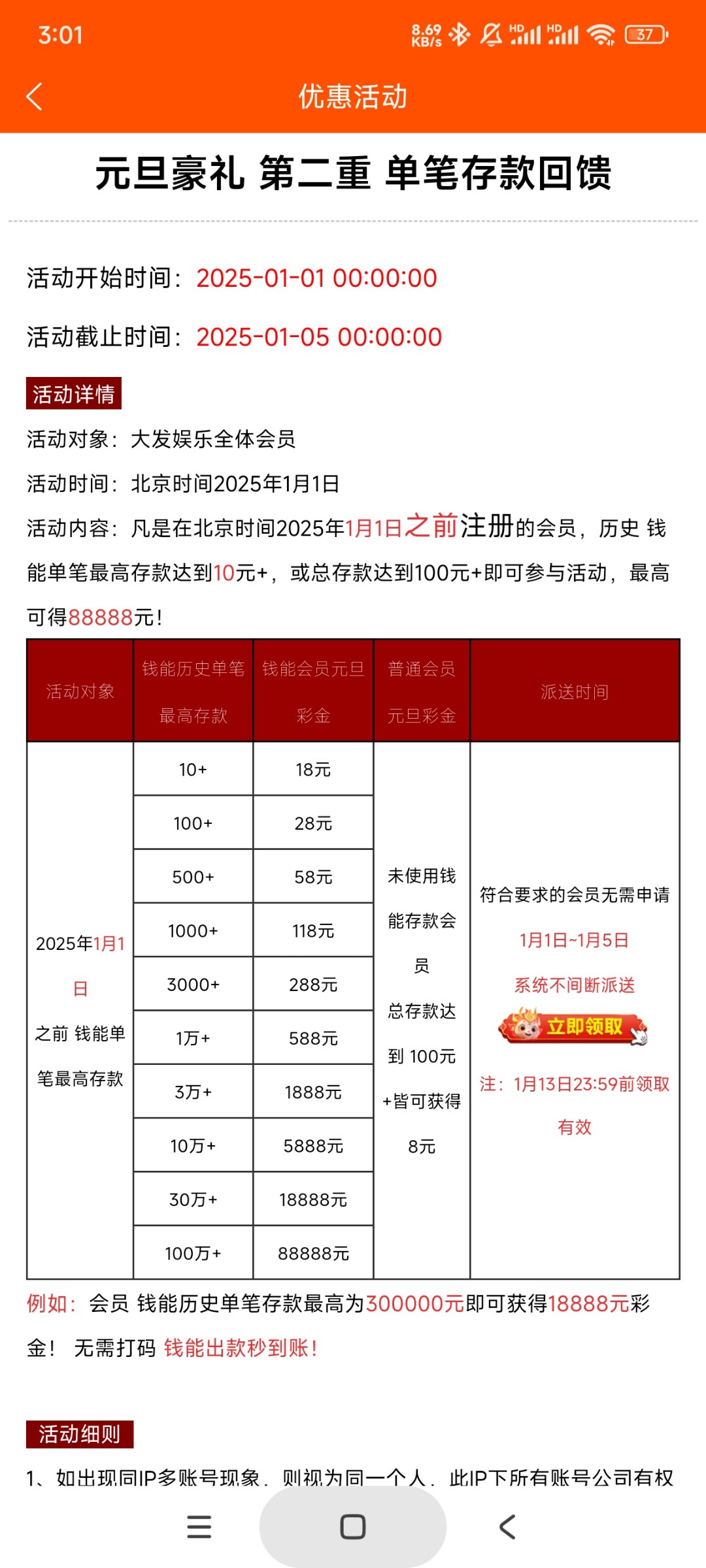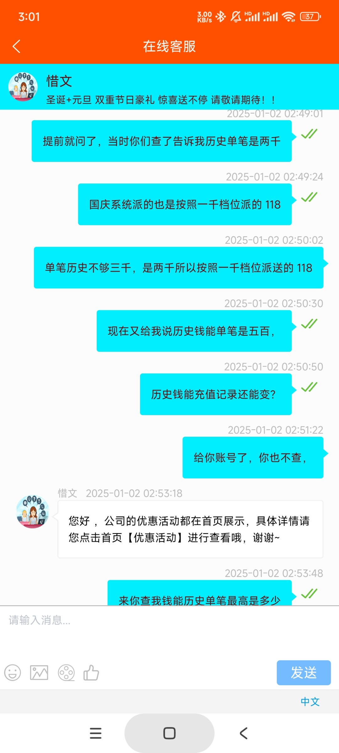 大发989钱能历史最高存款,元旦活动和国庆活动一模一样,之前国庆我就提前让查了,说历史单笔最高是两千。系统也是按照两千不够三千,一千档位派送的 118。这回元旦一模一样活动档位,给我按照历史最高五百算的,派的 58。历史存款记录还能变,找客服死跟我犟,就说些废话,让他再查历史单笔最高记录,就是不查,意思就是系统派多少就多少。这破玩意儿
