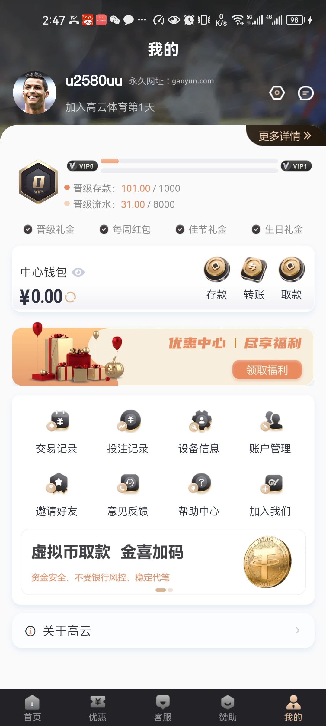 下载手机APP 注册并完善真实信息包括真实姓名 手机号 银行卡等个人信息 新注册会员未存款的情况下最高提现100元 如果提款超 过100元 需要存款到对应的钱包余额并满足 存款金额+盈利彩金 https://a88.gy