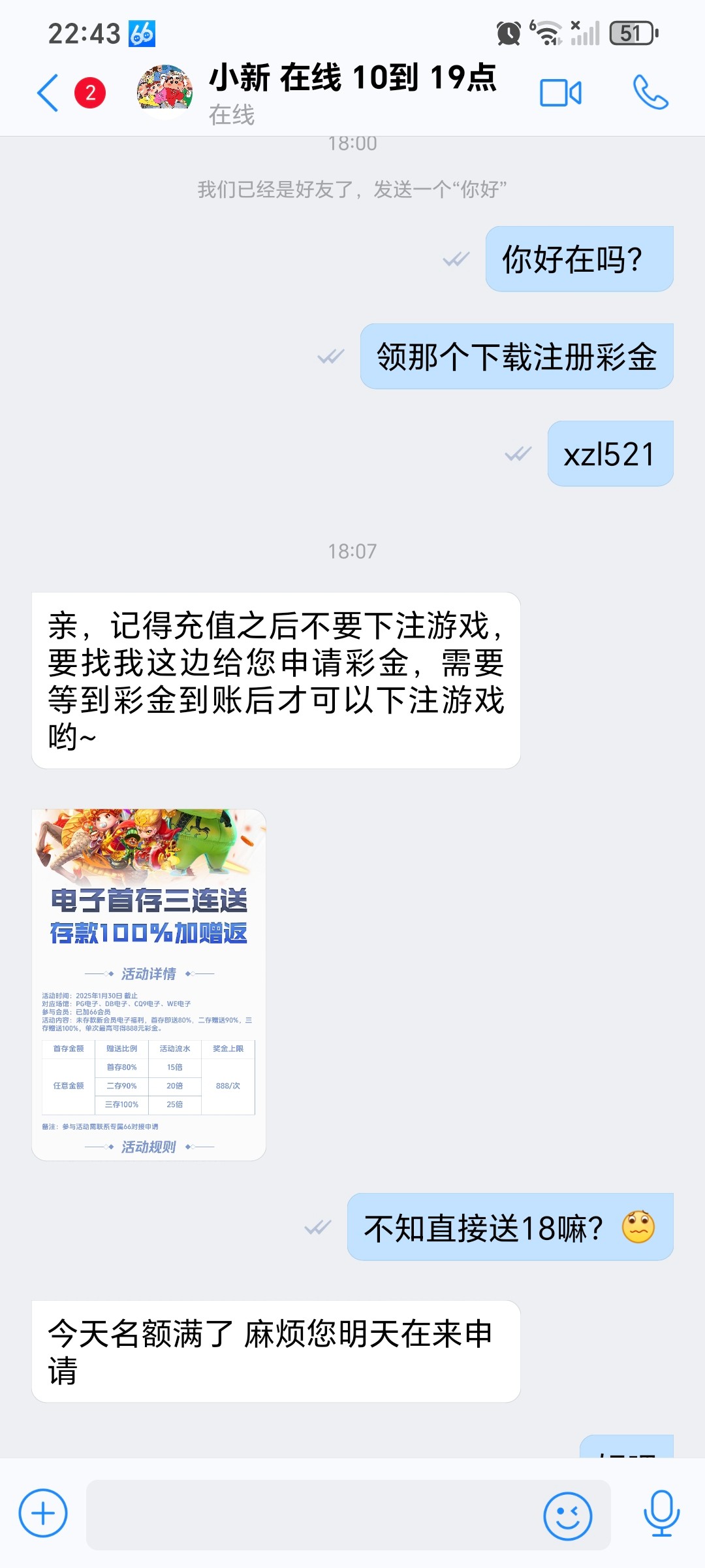 客服如果让你留69号,你留了等个二十分钟,如果让你加那个小新别加换个客服,然后夜间的这个直接送了