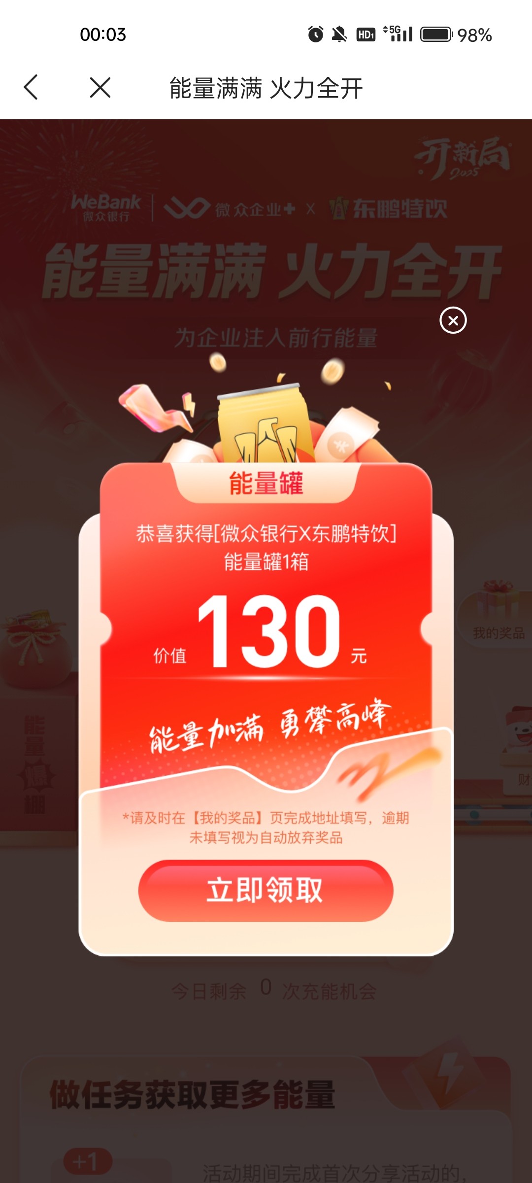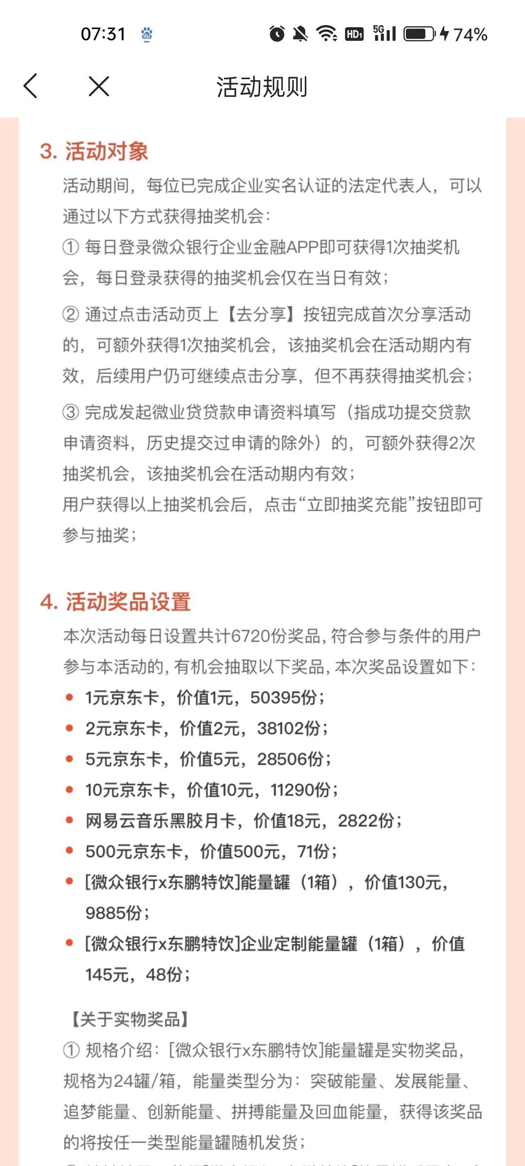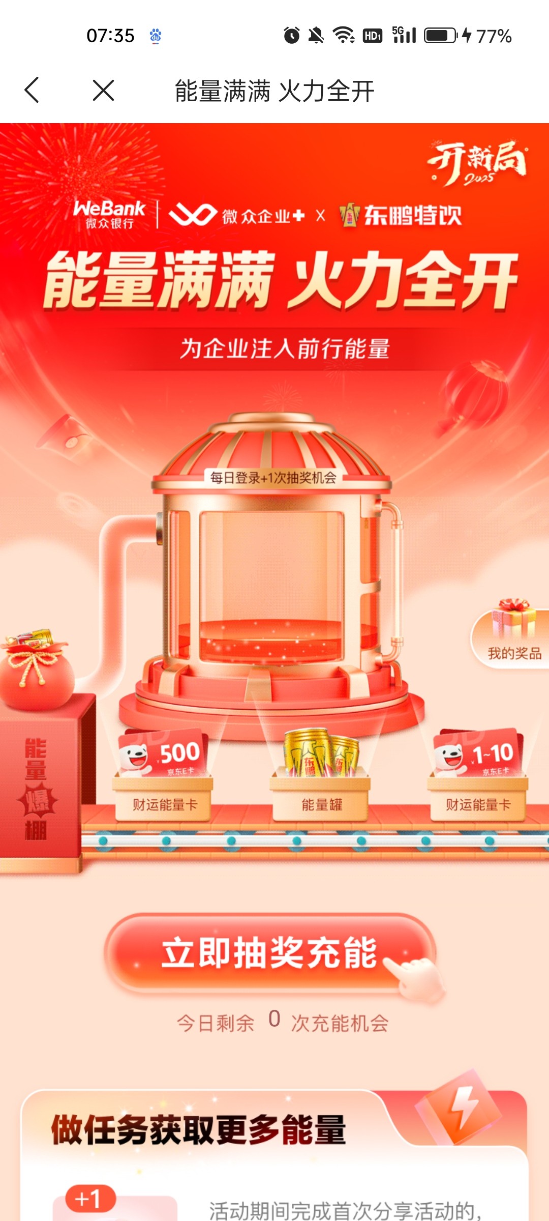 老哥们应该都有执照,赶紧下载微众银行企业金融,认证好执照点里面新年新开局里面有个抽奖的,运气好有500京东卡,不小心中一箱东鹏