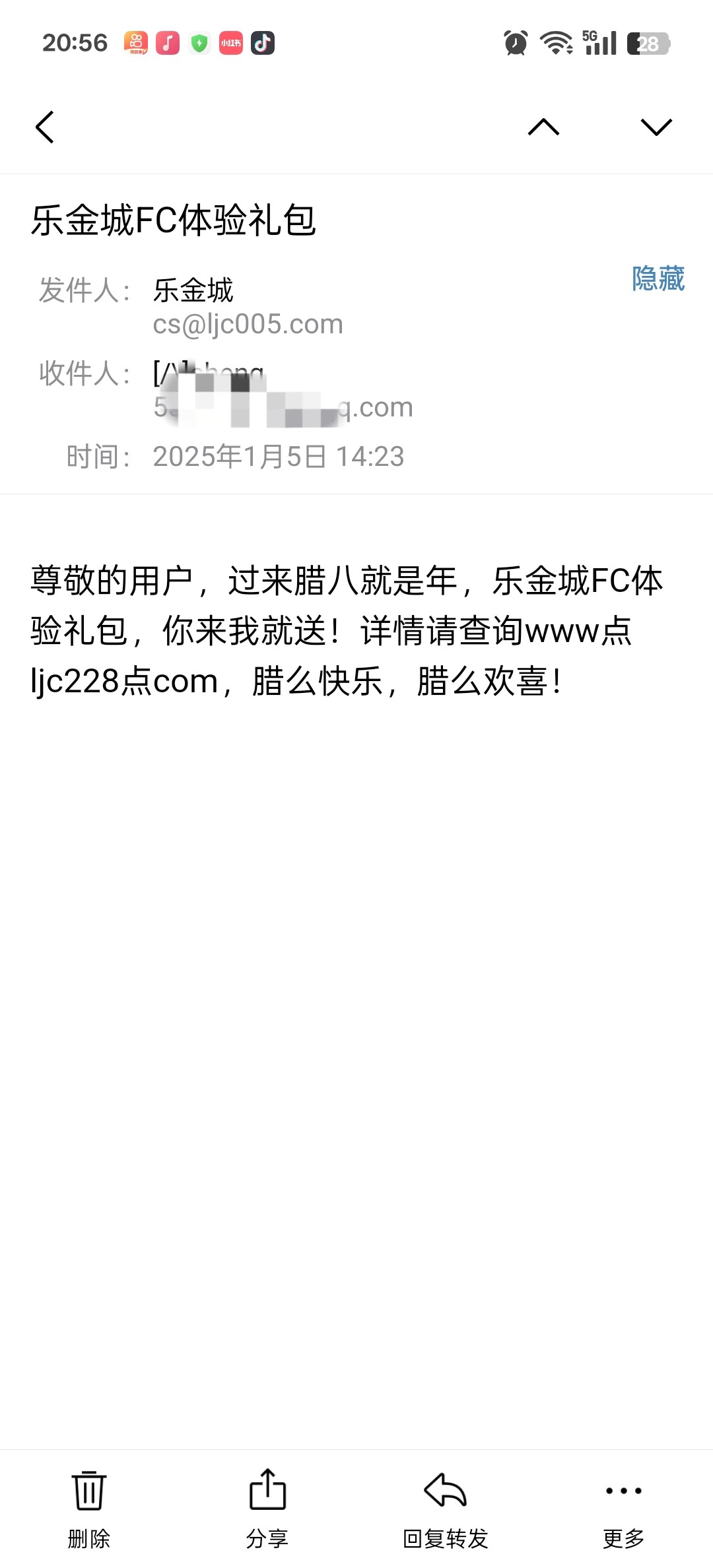老哥们,有邮件的去看看,乐金城明天fc电子上线,过了12点送体验金! 链接www.ljc2025.com
