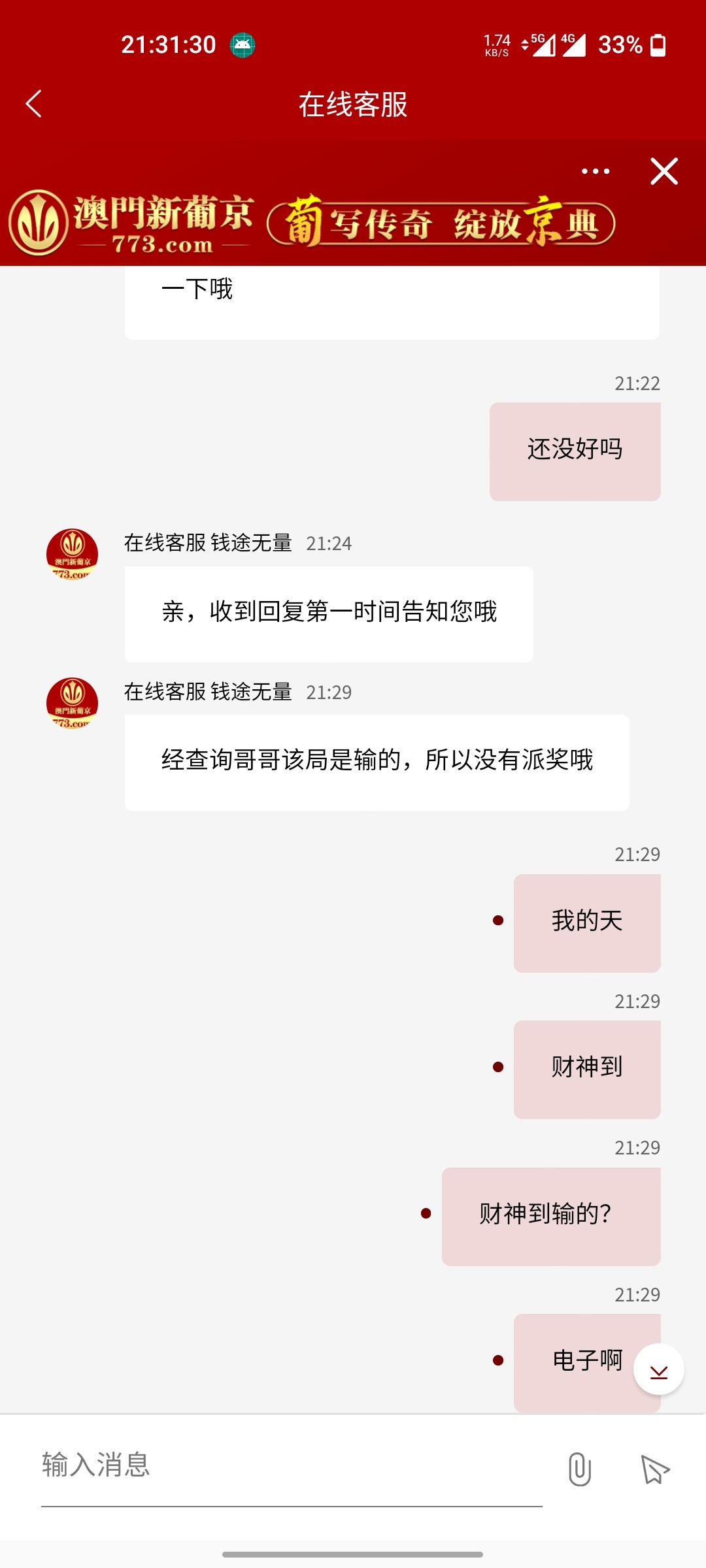 充值500进去一直摇原本还有380的,然后爆了130多想着回本了,一看上面余额没派奖客服回答是输的,爆浆了还有输的这一说法第一次见