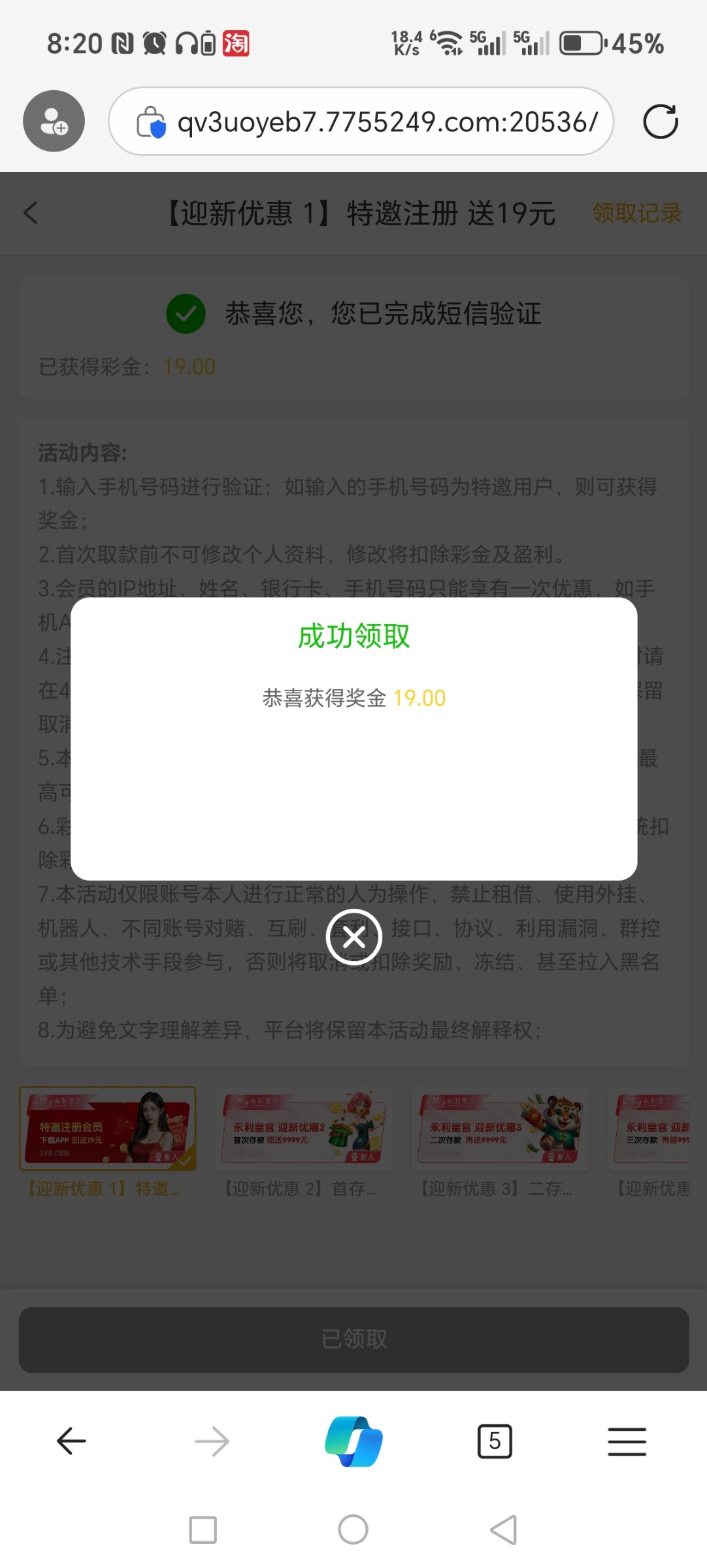 领到了.一飞冲天打到130结果一看要190才能提现,去梭哈一飞了,三倍跑结果刚好三倍炸给我来了个兑奖失败