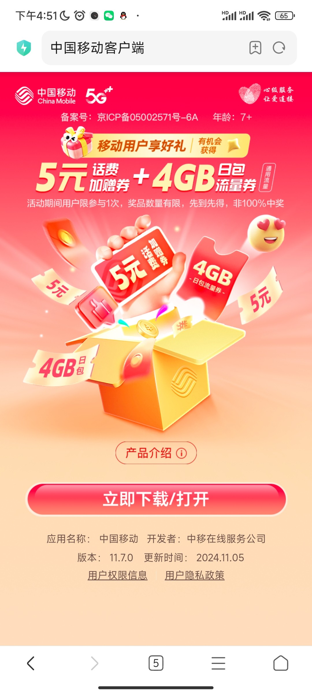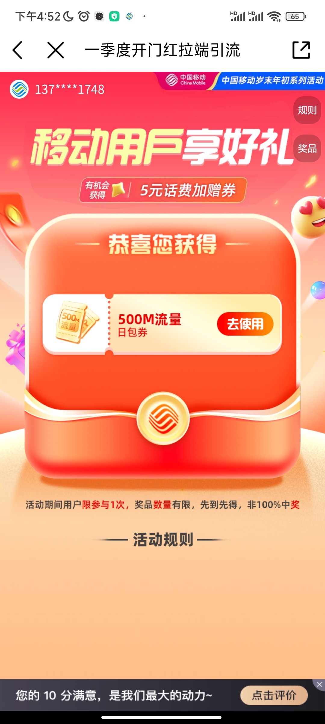 限移动浏览器打开链接,跳转移动app领取随机话费或者流量