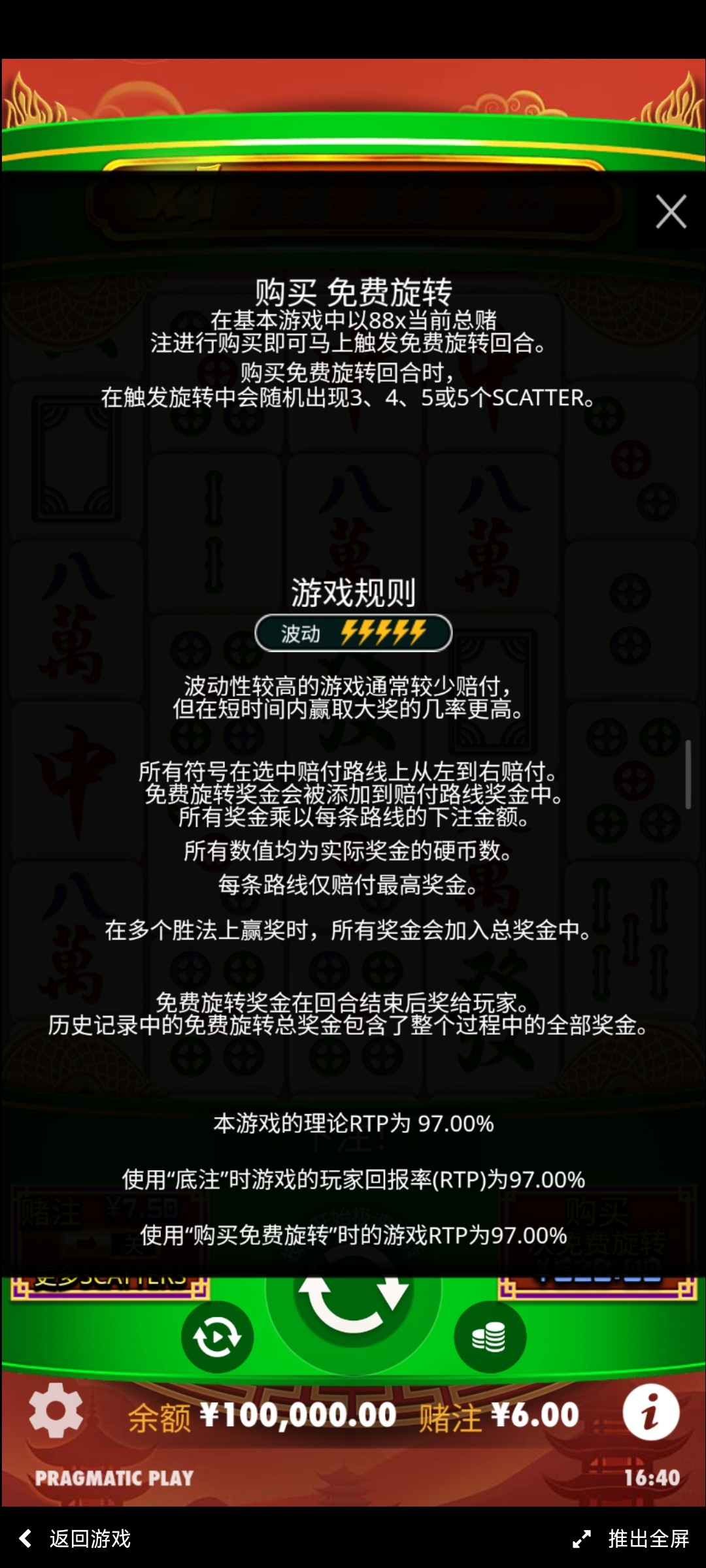 pp里的麻将大胜2,官方试玩显示这个游戏返奖率97%,其余大多是96% 应该比较好刷水