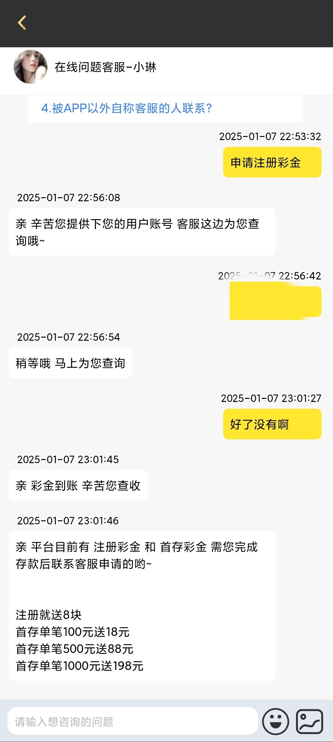 下载app注册完善资料联系在线客服申请 彩金打满50手 打够100就能下分 客服回的有点慢 耐心等待申请成功即可