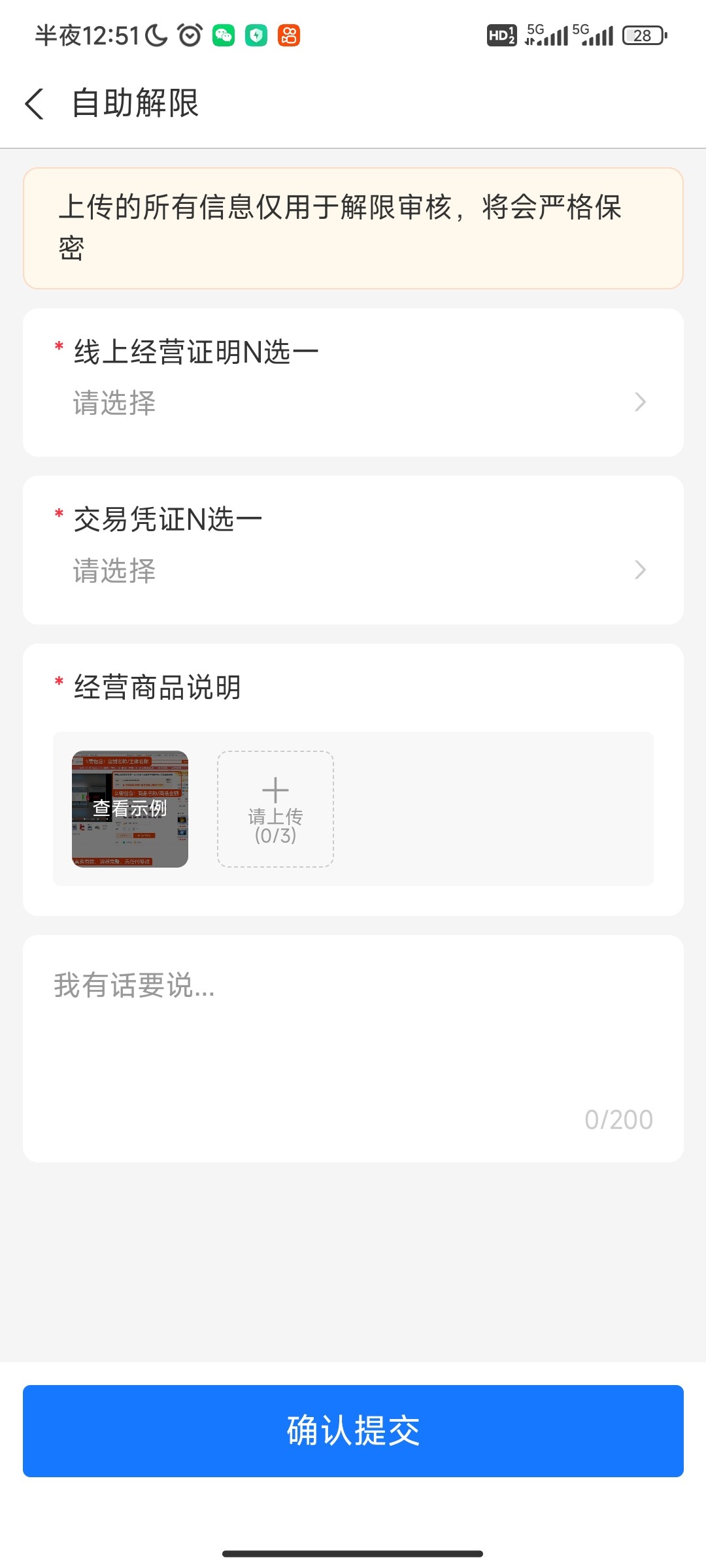 我开的商家是线下的,直接去超市买一包烟,一张超市商品照片、一张支付小票,就给解开了