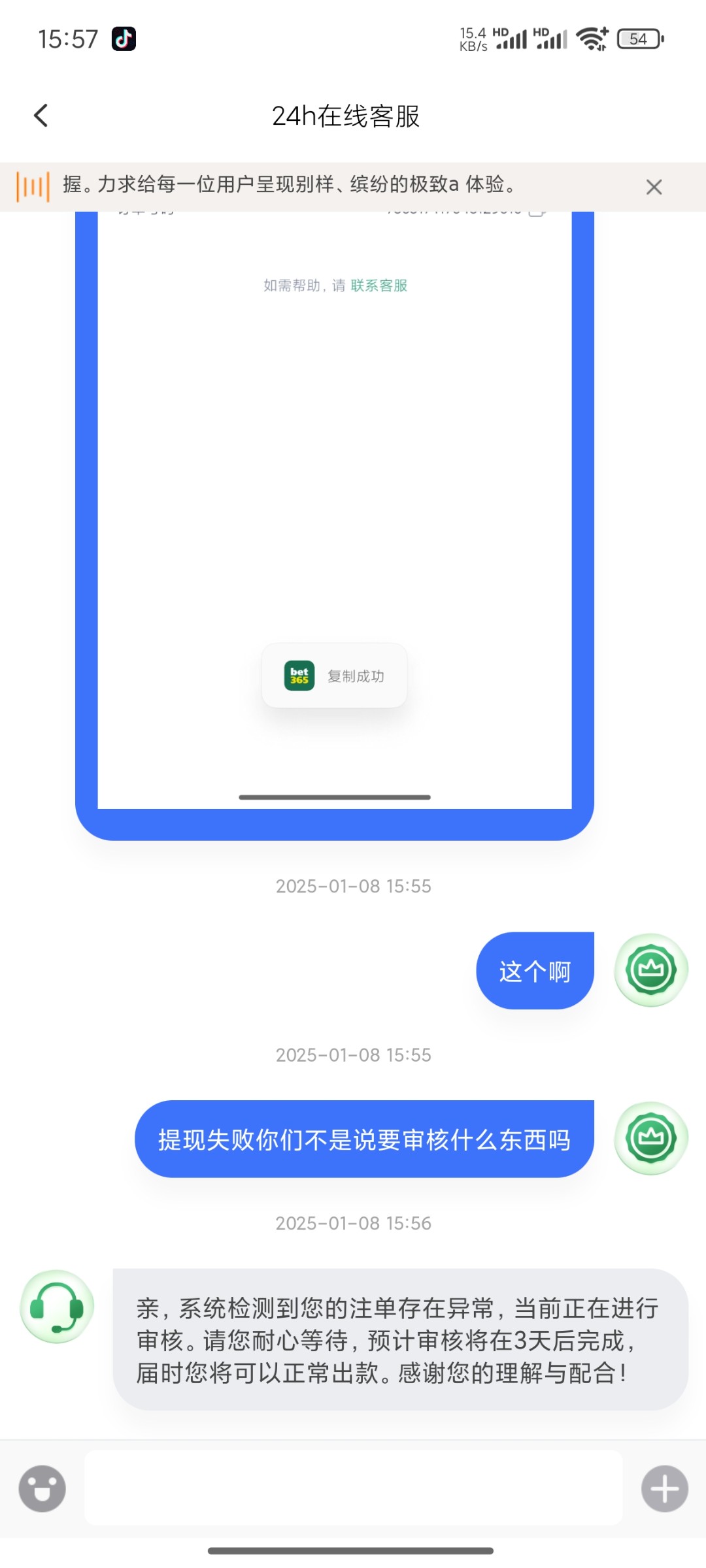 今天领了第二个电话388打到1013提现到账了 然后我又充值700进去拉电子8块钱女王炸了770倍 提现失败问客服说注单审核 这肯定要黑的节奏