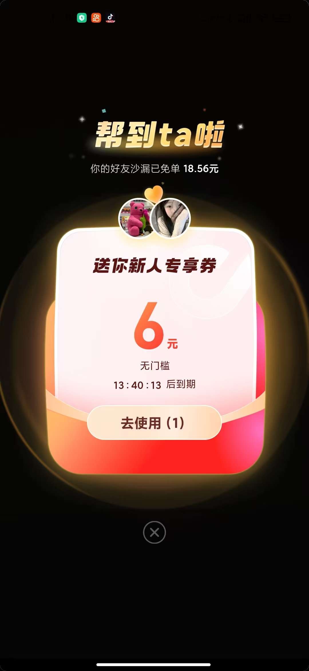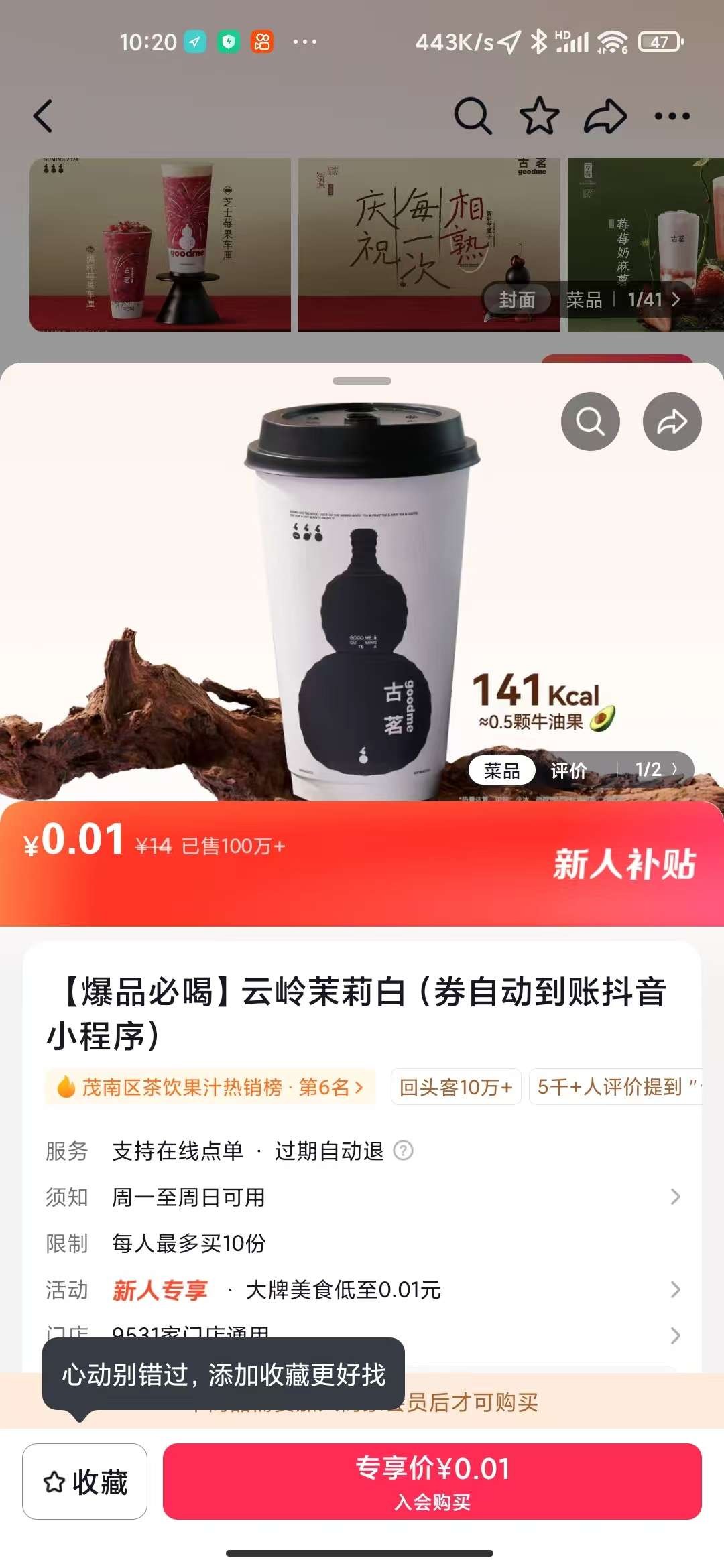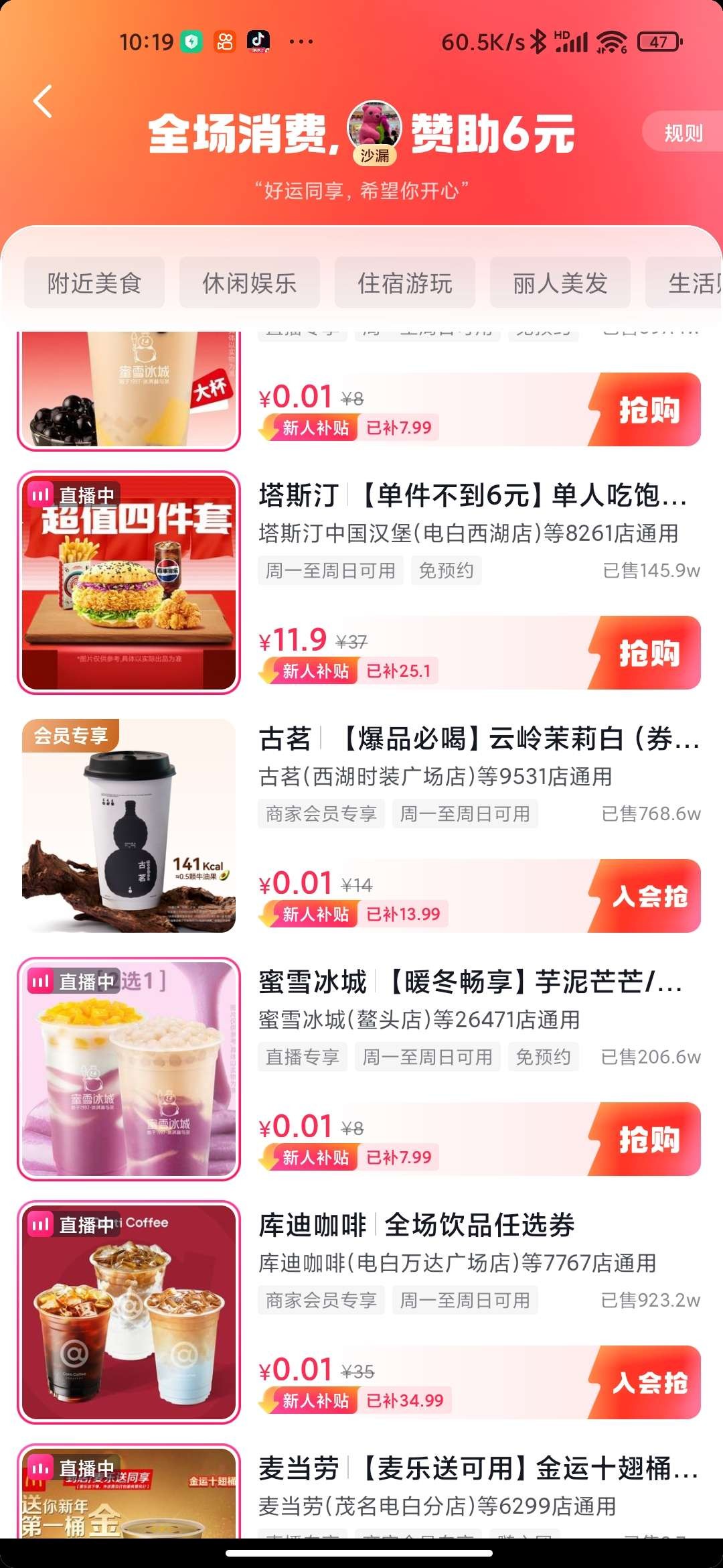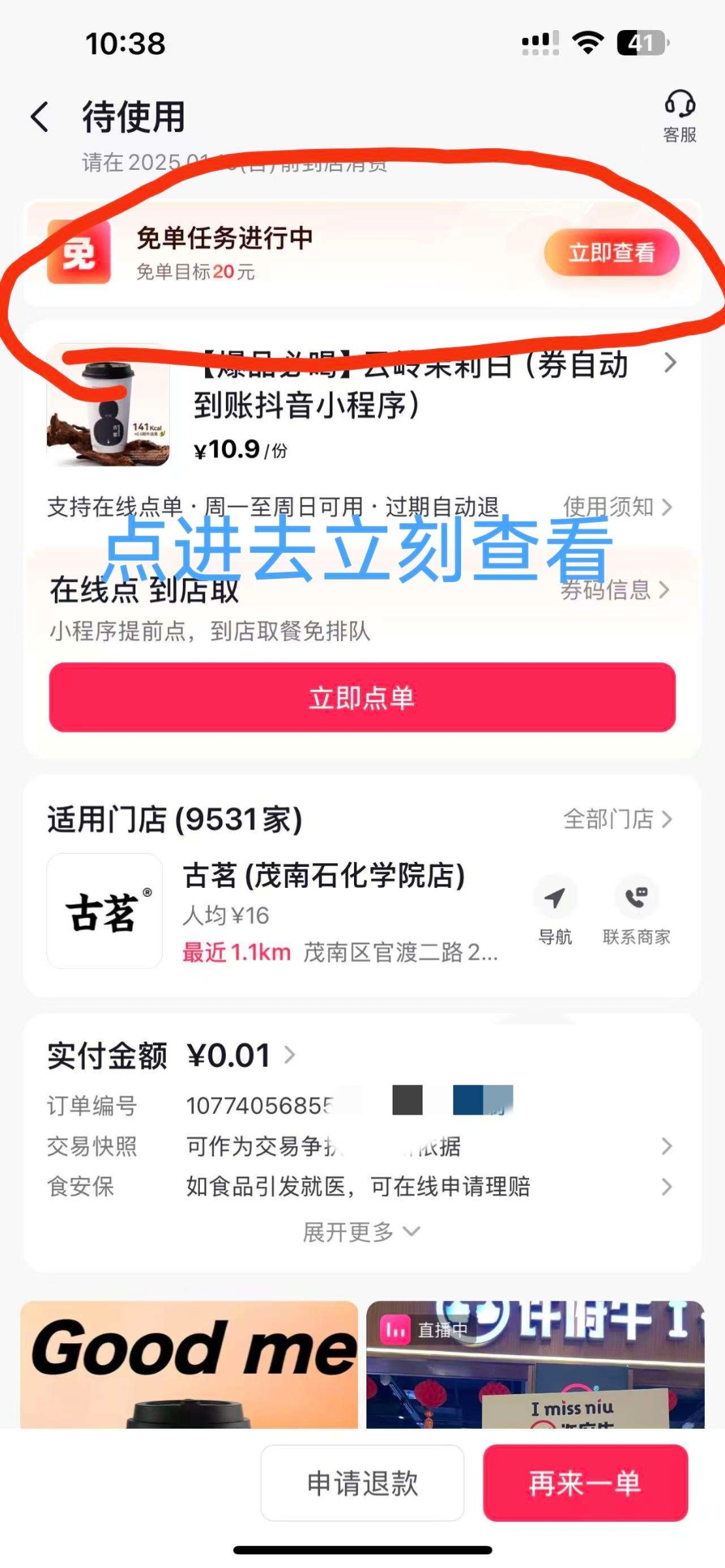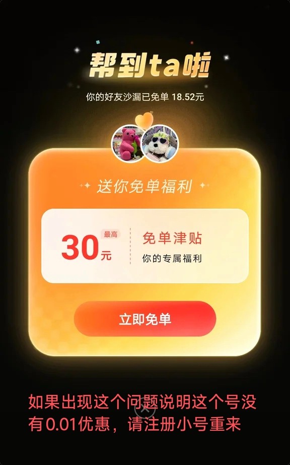 抖音点-我,点-三条杠,点-我的订单,点-我的订单,点-待收货/使用,里面必须有一个未使用的团购订单,然后点那个订单,订单上面有一个:免单任务进行中活动!然后点进去:立刻查看!点进去后页面右下角有一个面对面扫码,然后用一个抖音扫码,如果出现助力说明你这个号没有0.01优惠,如果出现送你6元优惠券说明你这个号可以0.01撸奶茶!没有0.01的号可以注册抖音辅助号用辅助号来领!抖音点-我,点-三条杠,点-设置,点-切换账号,点-添加或注册新账号,点-创建新账号,点-当前账号辅助创建!建立辅助账号后就可以重新第一部步骤领取了