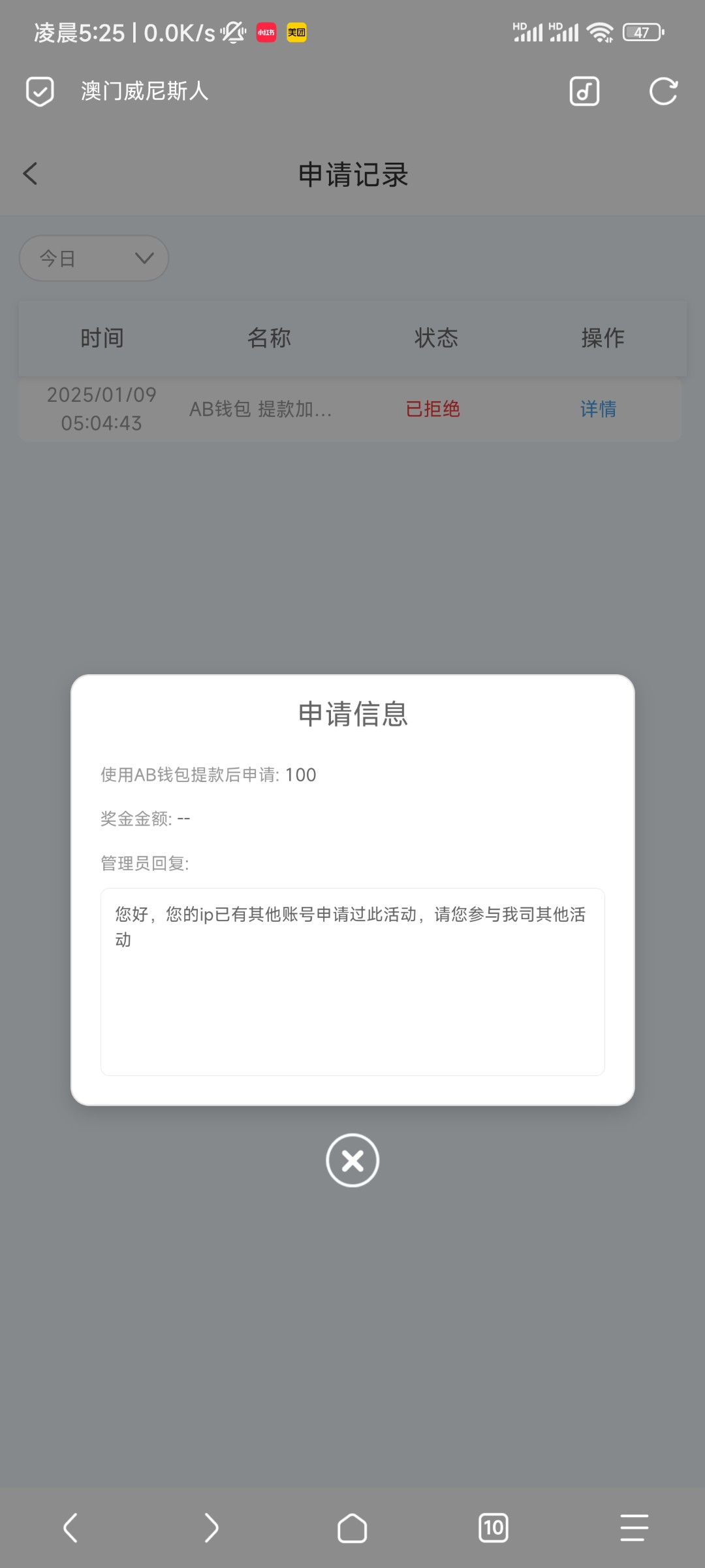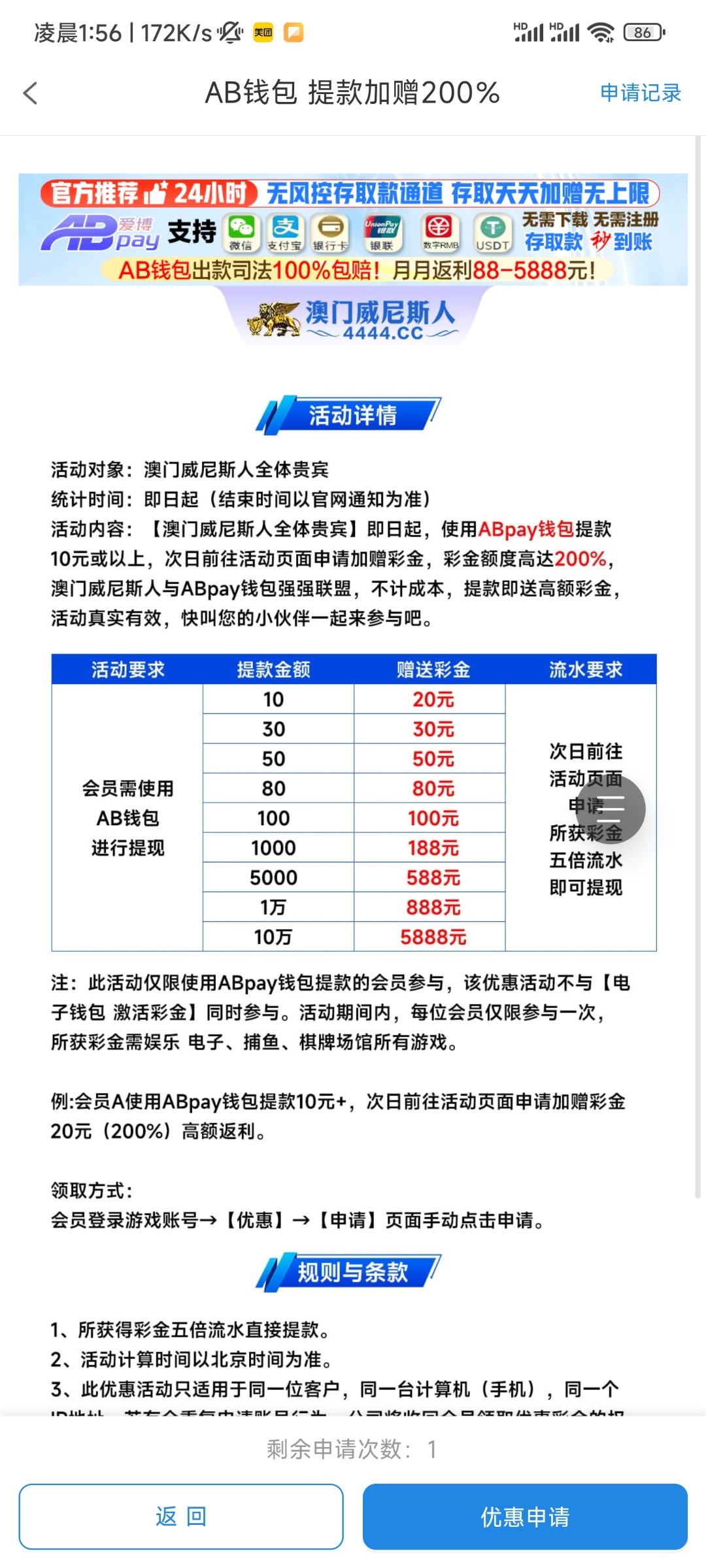 这个只能申请一次,他们这些平台都是一个公司,两个008还有一个722还是什么。如果你有别的技术,虚拟机,ip更改什么的,可以无限申请。链接最好是去一起看那个广告里边注册,官方,短信那些容易黑。这个不是每天都能,只能申请一次,一个人最多10个ab号