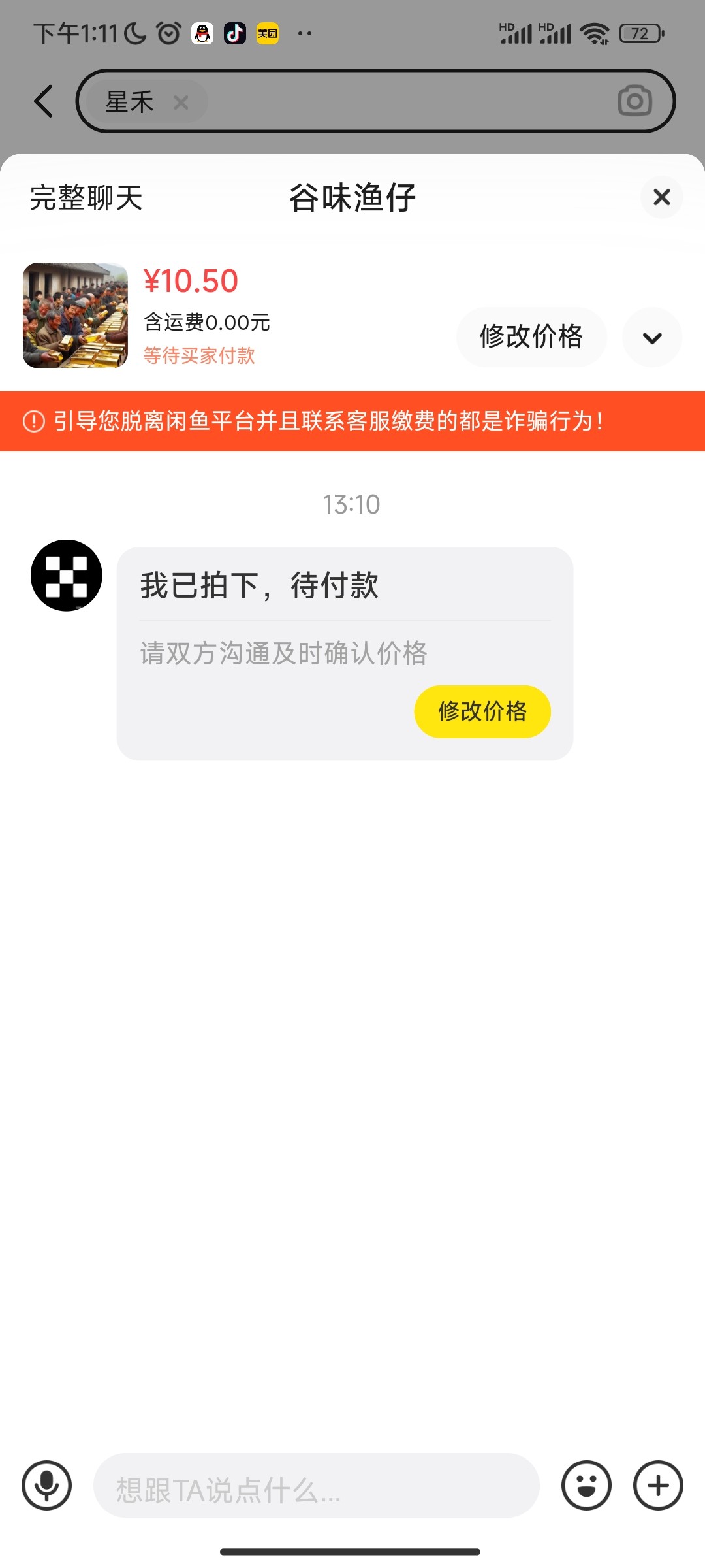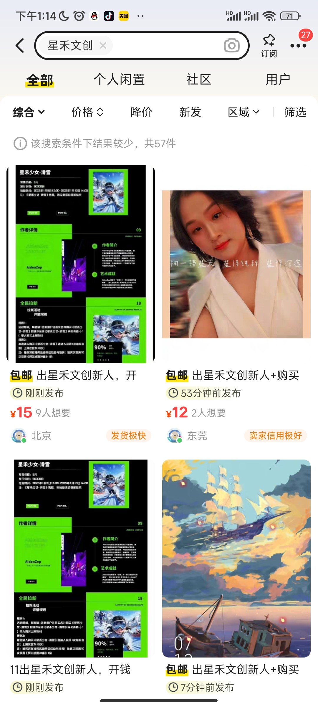 闲鱼点卖闲置发布出星禾文创新人人头,图片随便加一张,价格写11就可以了,开通钱包两块,买一个藏品5块,先赚一个牛子,这个台子挺火的,那个5块藏品个人感觉能搞个猪脚饭,重视一下吧