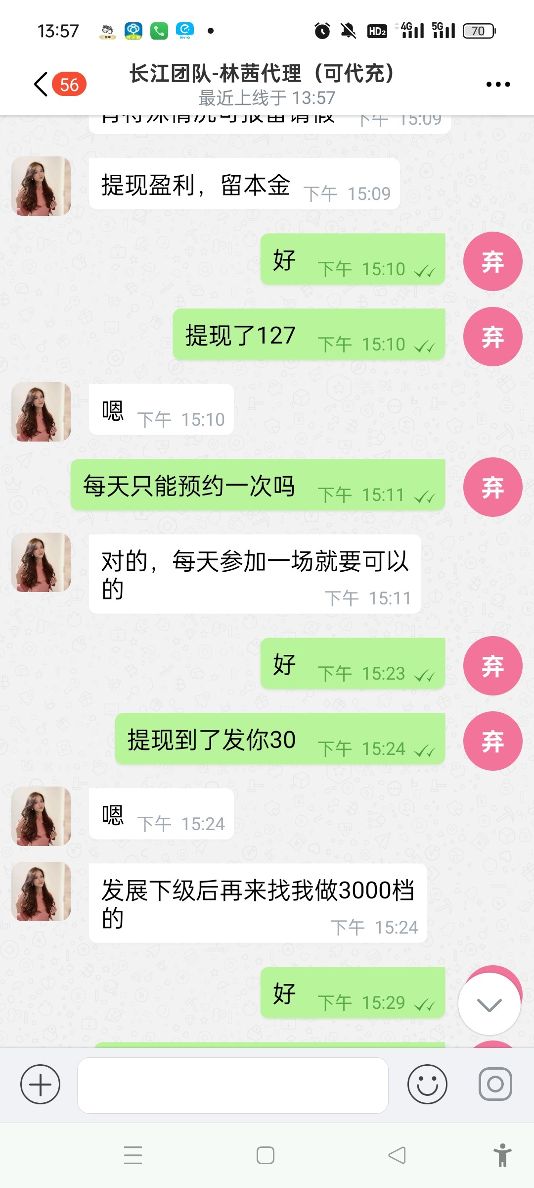 我撸了三天赚了120 每天充100送28然后今天第三天不让我玩了,让我充五百,然后我就不理他了,刚开始充值的时候进微信群充值还抢了几百的红包,平台也没黑我还是给我上分了
