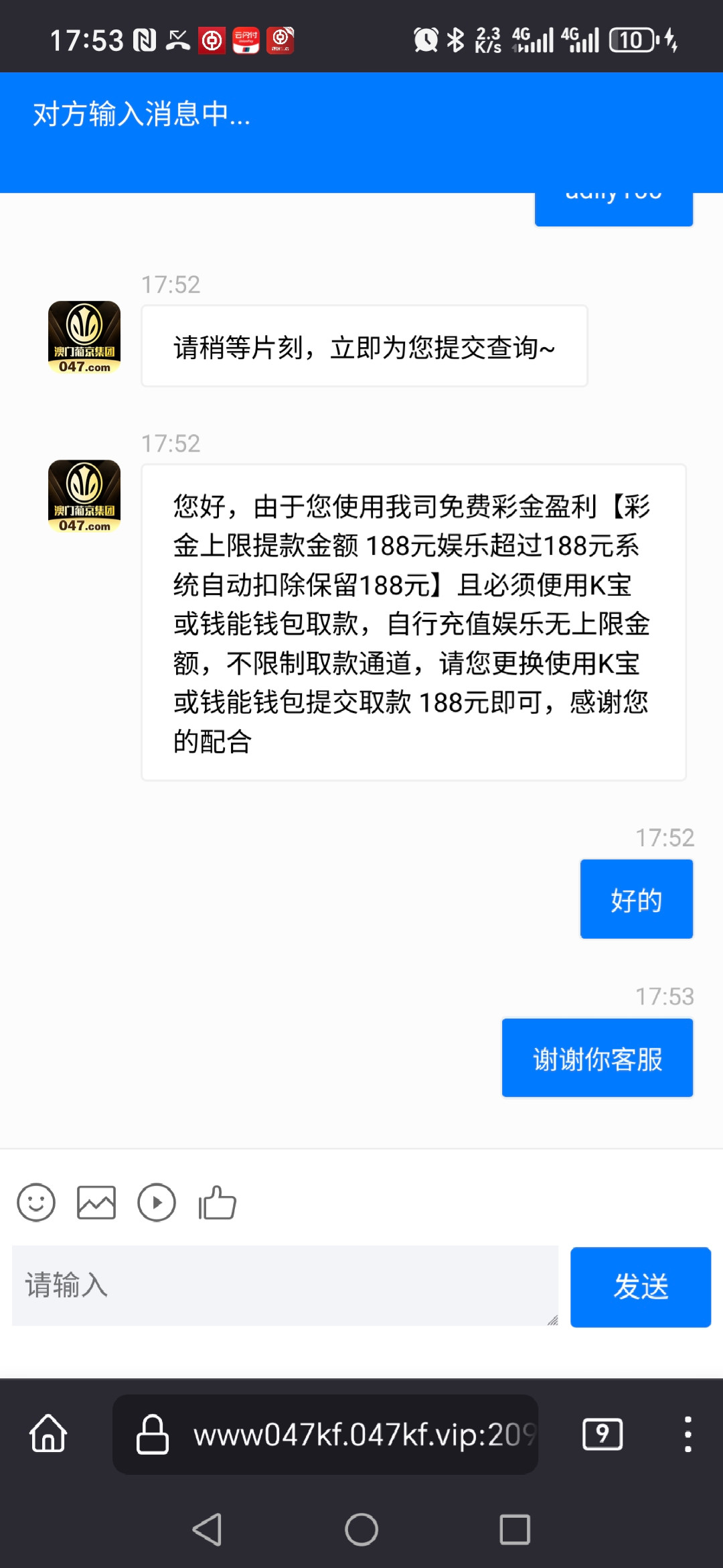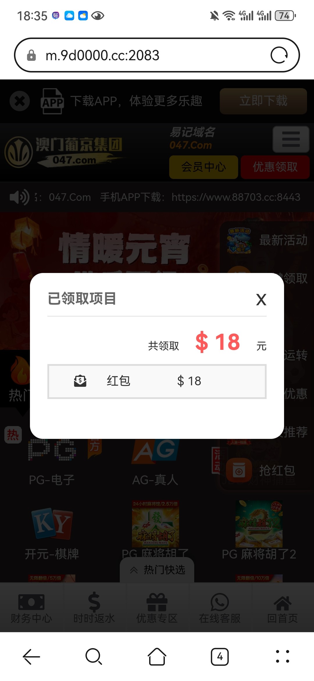 接到电话送18打没了,然后又登陆另外一个号(确定没接电话)也有18,都没出款,没充值过不知道黑不黑,老哥们可以去试试 047.com
