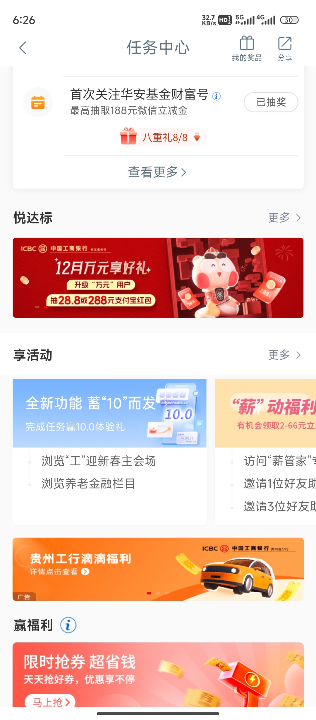 工行app任务中心下拉,享活动里找到"全新功能蓄10而发"完成两个浏览任务抽藏品。