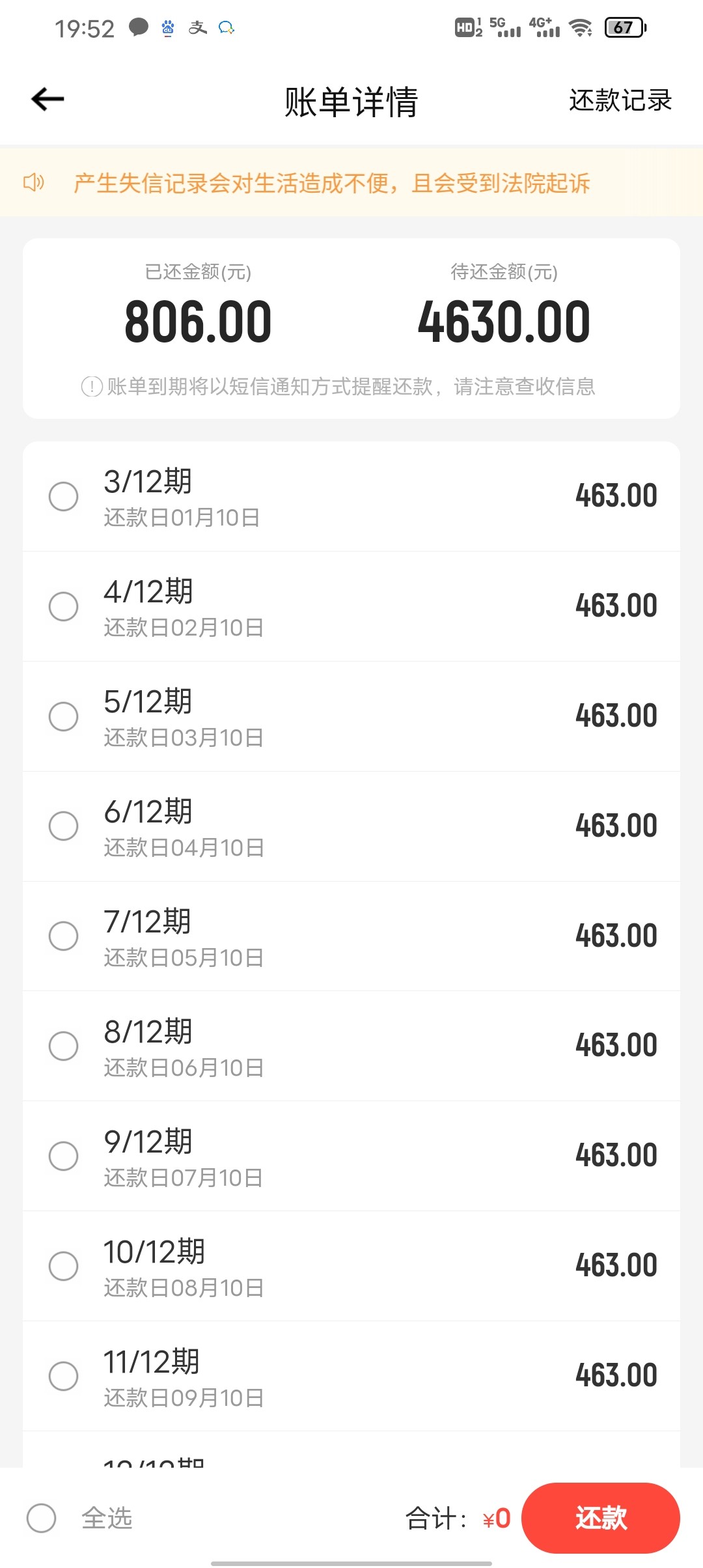 @ttjing123 ,我三个 自己用着一个还有两期还完了 其他两个有一个还了一期 另外一个已经半年多了没还过 一直说要起诉我 到现在也没起诉 坐等起诉呢