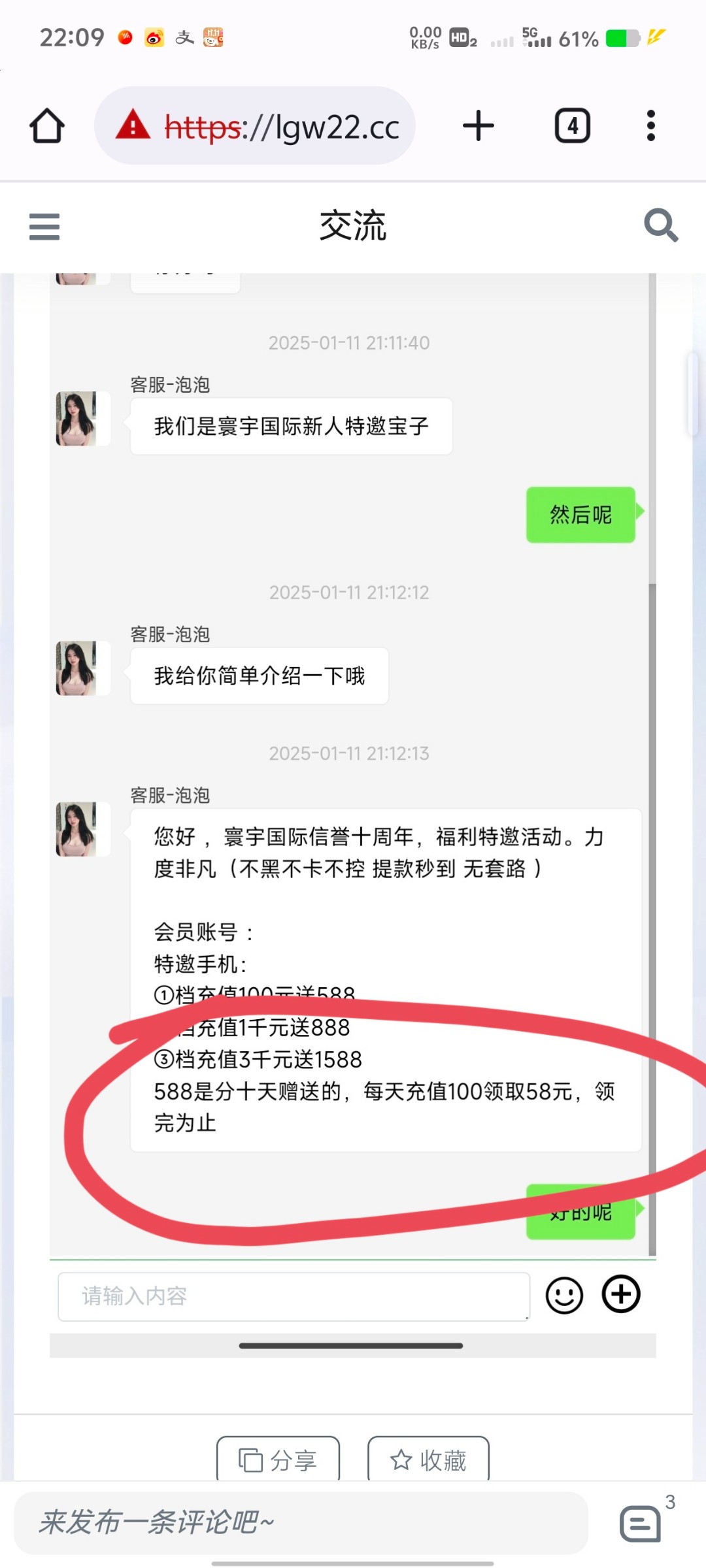 我撸过3个这种台子,说100送58,分10天送,每天充100送58,充了3天。领了3天58。3个台子加起来撸了2000多,充的最大一笔上头了,充了6000,然后提了11000,也到了。看台子格局了。