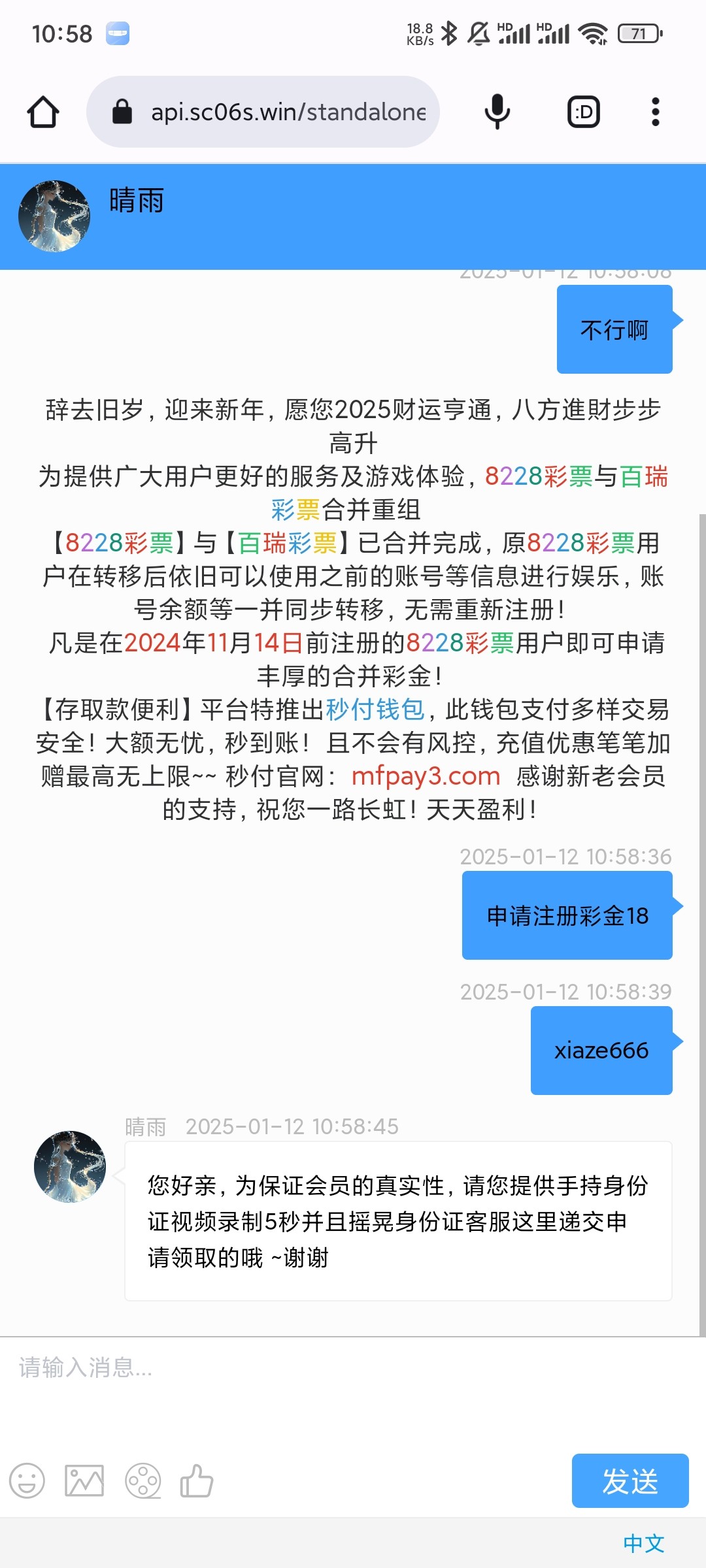您好,为了保证用户的真实性,这里需要您提供 纸条写明:百瑞彩票三色彩【年月日时间】 提现多少元,并附上银行卡和身份证一起拍照后 再进行录制【10】秒 手持身份证 正面视频并且翻动身份证正反面发送给小妹,为您提交财务部核实身份后财务部为您出款哦,谢谢