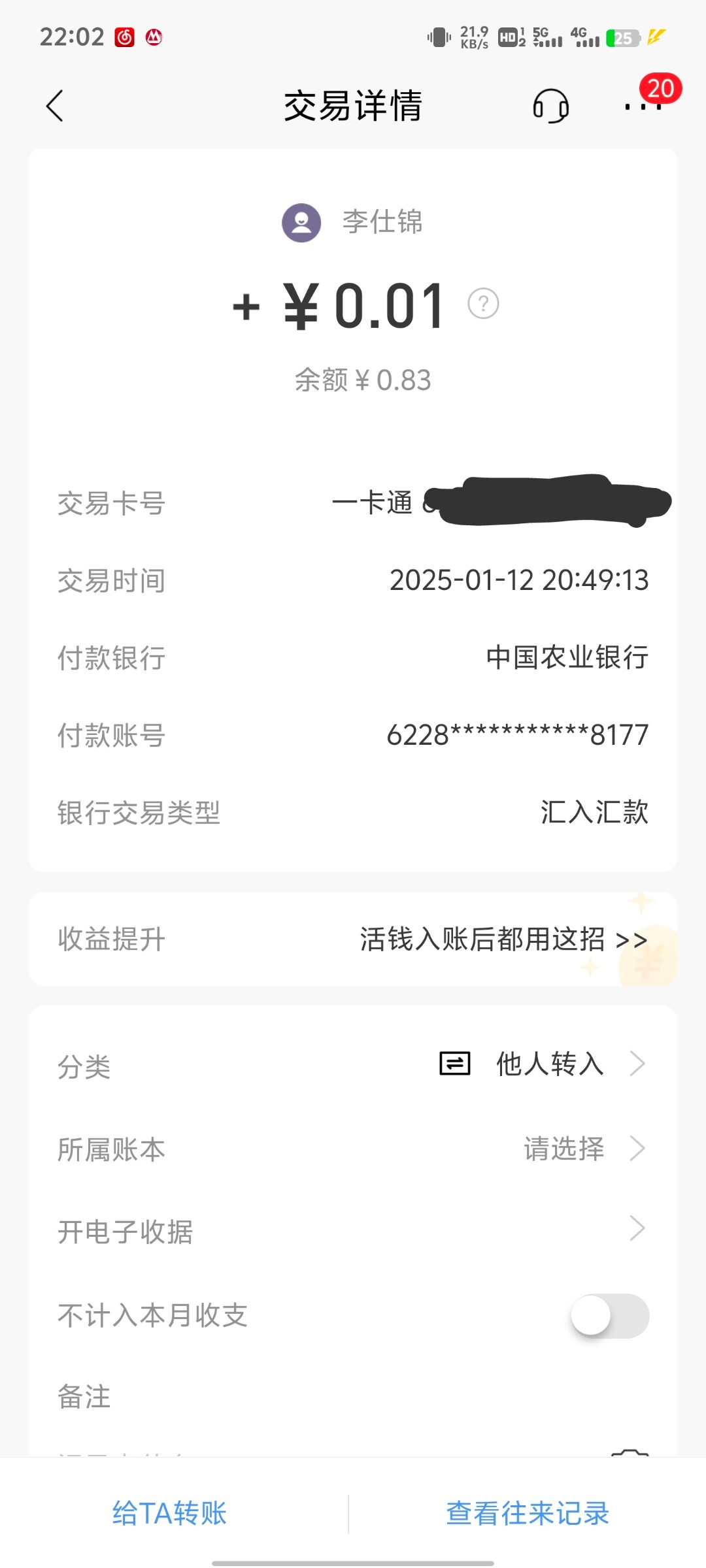 是这样的老哥们,今天晚上有人给我银行卡转了0.01我退回去了,我也不知道什么情况,不认识,也没提款过,然后又隔了一个多小时有人转了100还是支付宝转卡的,这是黑钱吗还是什么情况