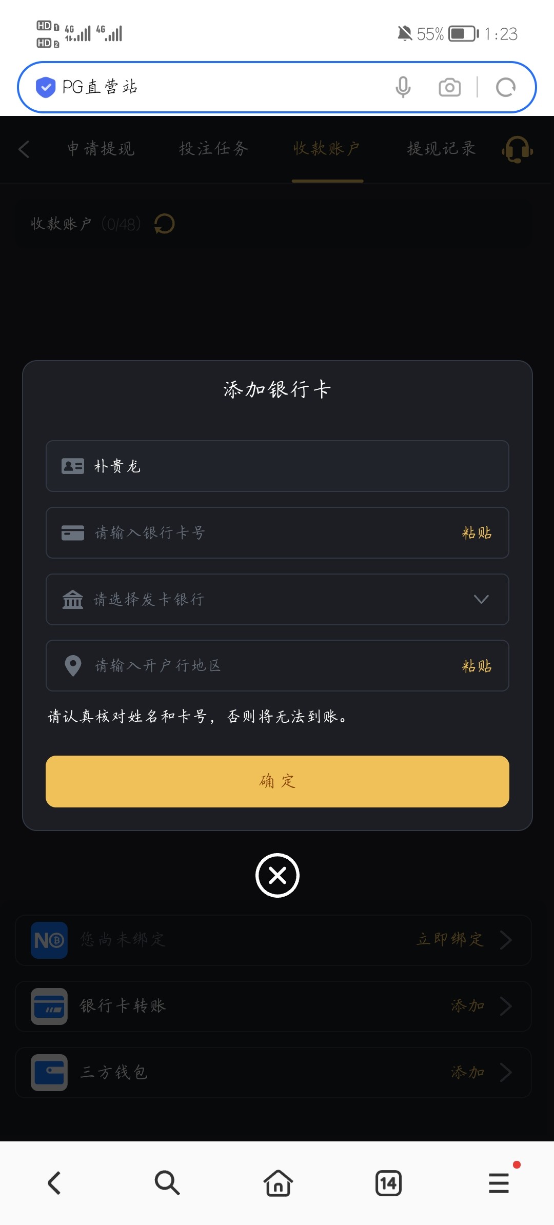 用别人的名字根本绑不了卡吧?你有别人的卡号?