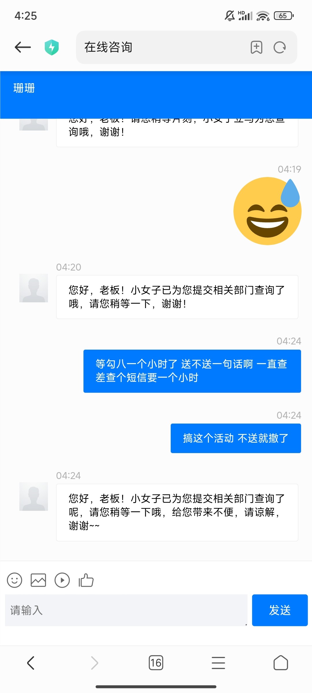 煞笔台子等了一个小时一直早起查询,骂一顿秒送