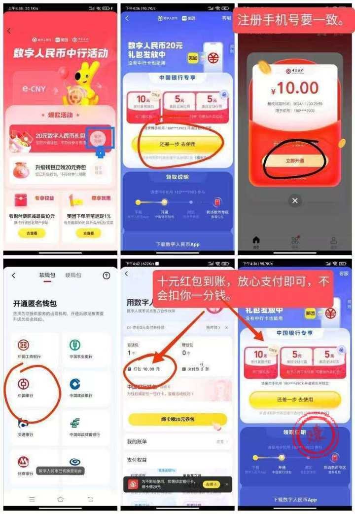 1美团搜索数字人 民币,找到中国银行活动按图点击跳转下载数字人民币(不限新老),无需实名绑卡,设置支付密码就行,然后有十元团红包,美团外卖搜不到,数字人民币注册的号码要和美团的号码一样才可以领了券之后不需要自己出一分钱,他扣的钱是你领的那个红包的钱
