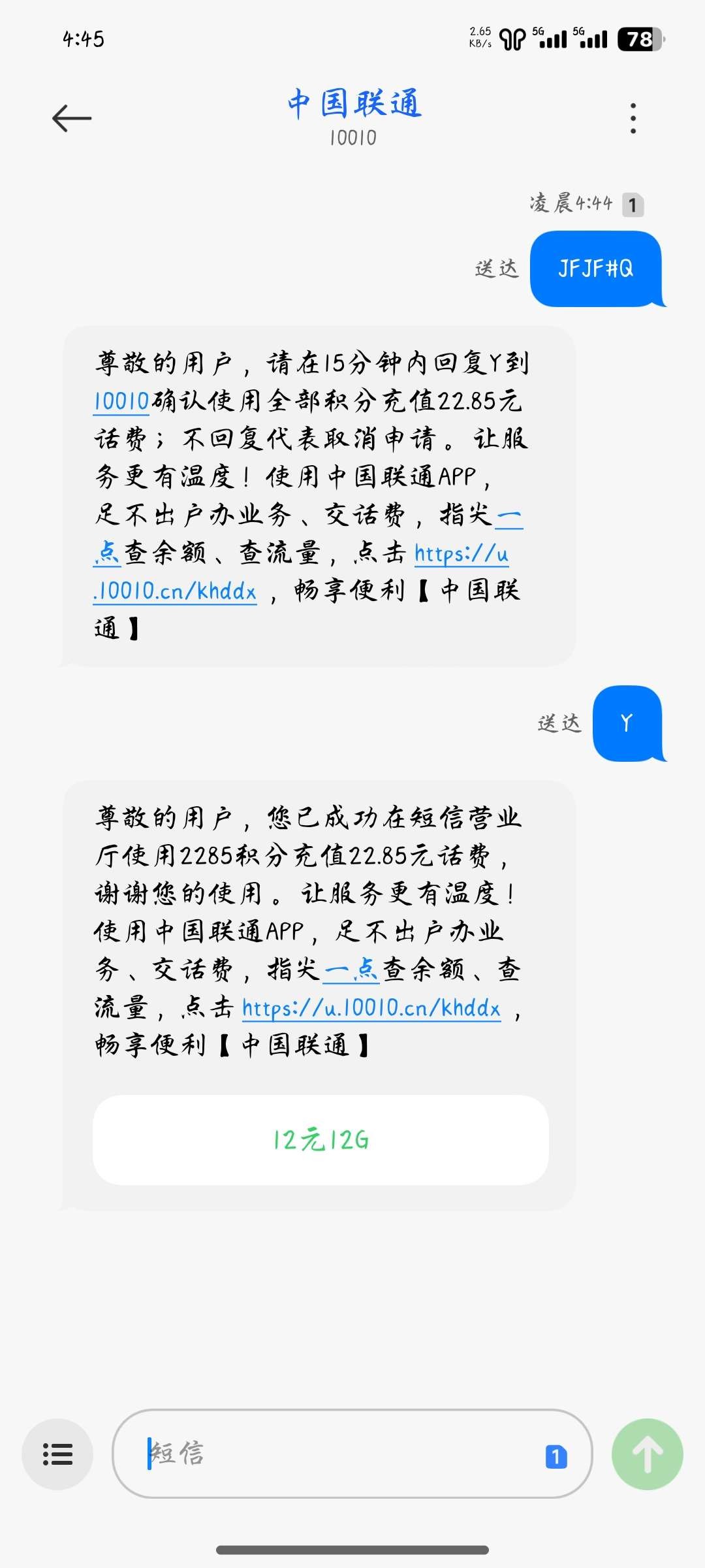 发送 JFJF#Q 到 10010