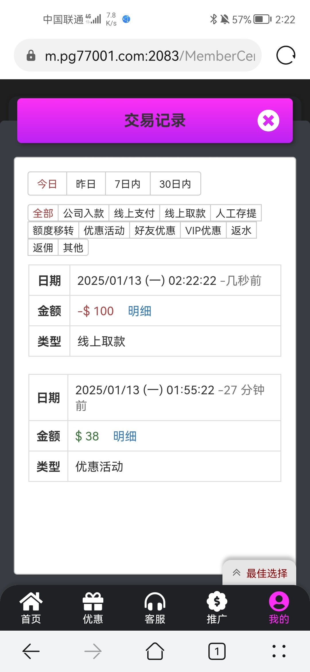 回馈38,提款已到 有号的可以上去看看 网址www.77pg.cc