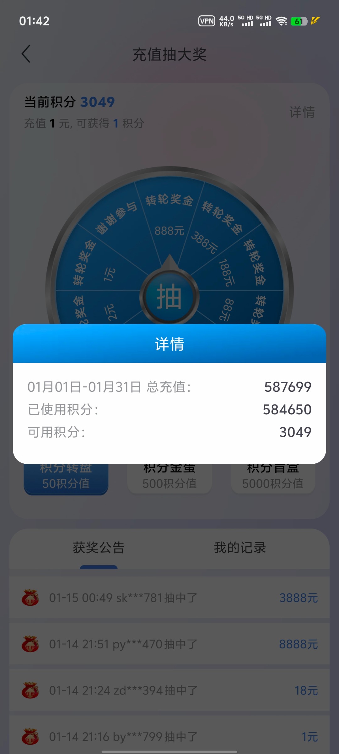 积分一点没用,50多万积分。抽50一转太浪费时间,平均1000积分估计可以抽30-40吧,我觉得费时间全抽5000积分的,5000积分经常空,不然就是8块,奖金60万积分就一次58,偶尔18