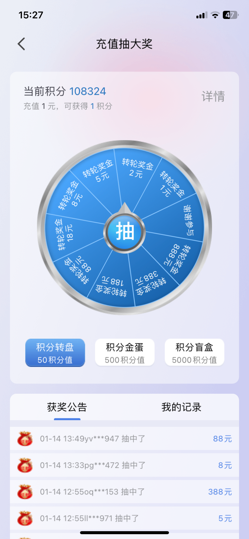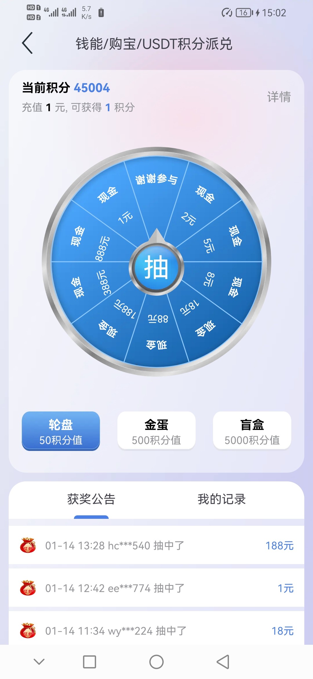 用50积分抽 别用500跟5000 50积分还能偶尔中个一块 其他毛都没有
