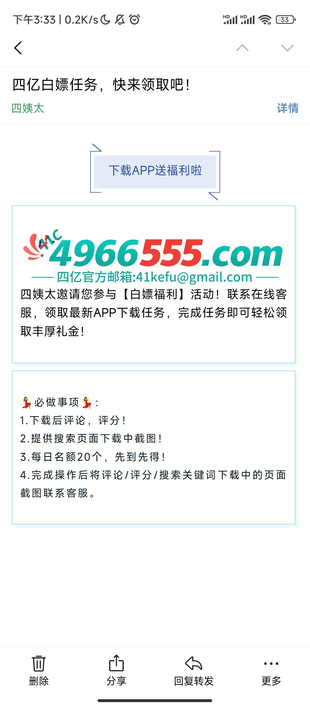 苹果手机收到这个邮件的,截图找客服,客服会让你下载一个app,然后评分截个图,具体操作客服会给你讲,应该都是13.8块钱,彩金没有游戏限制,我没打出来9887c156.cc