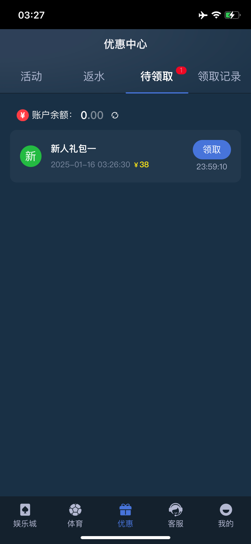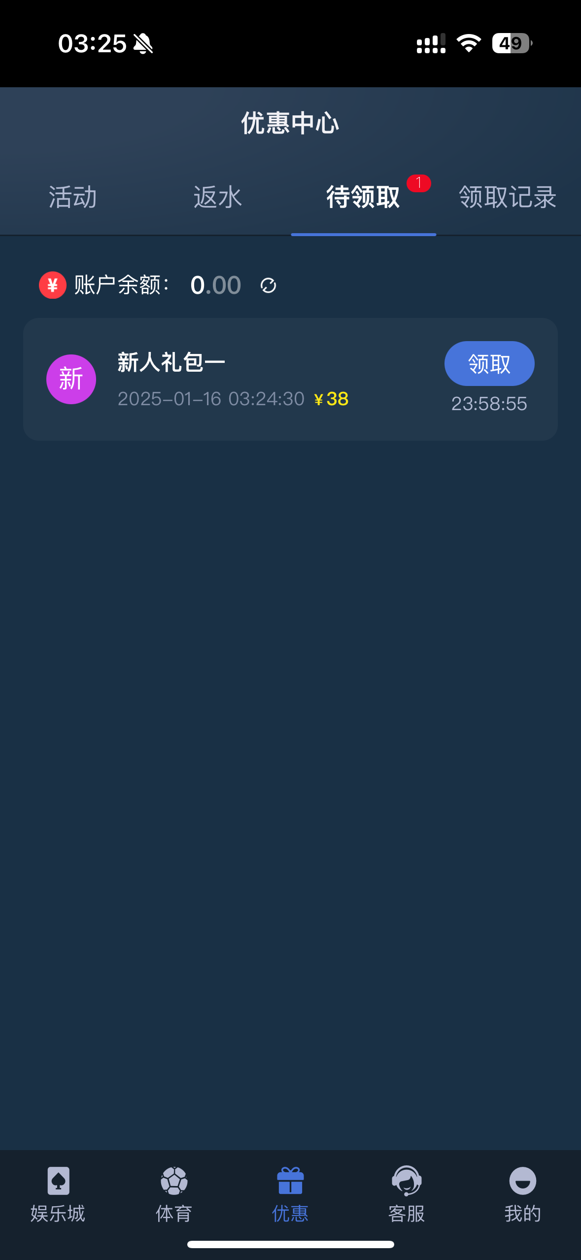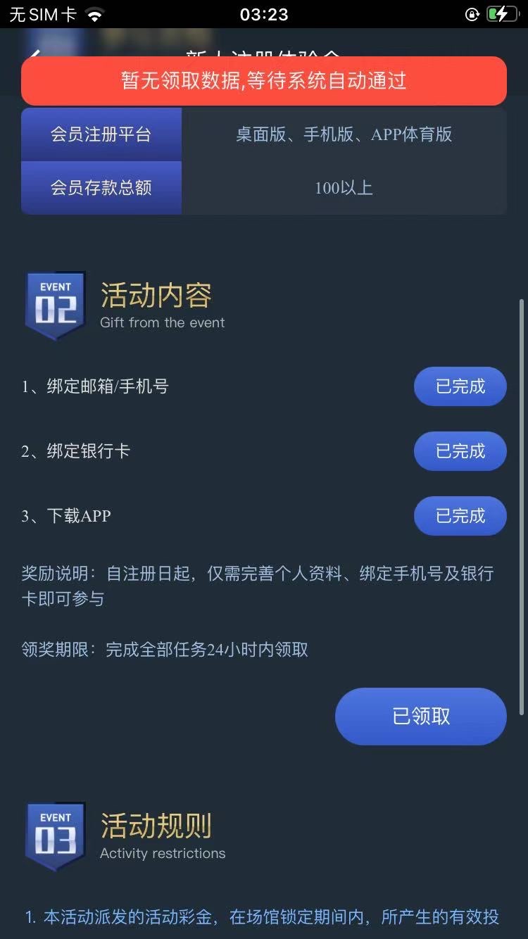不用充值啊,提示暂无领取数据,等待系统自动通过什么的,过一会就可以了,优惠里面有那个待领取的,直接领取就到账了
