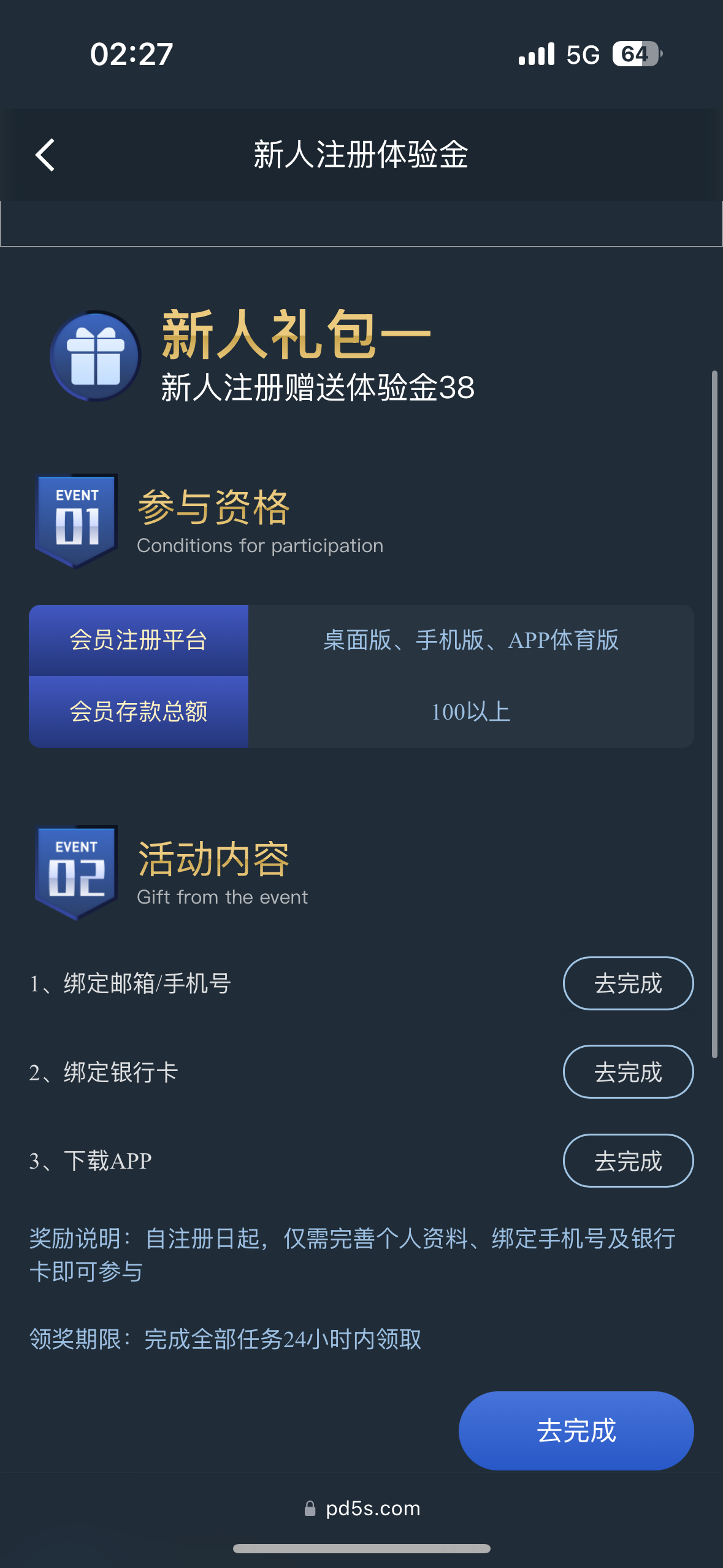 流程:注册-下载app登入-绑定手机号/银行卡-完善个人信息即可!地址:https://pd5s.com/#/personal
