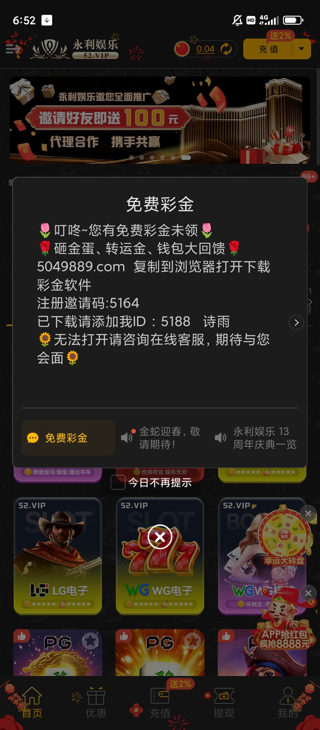 擦 登入没有 但是看到站内信 之前有好几次神秘彩金没领 还有注册彩金 也没领 现在都领不了 错过了一个亿