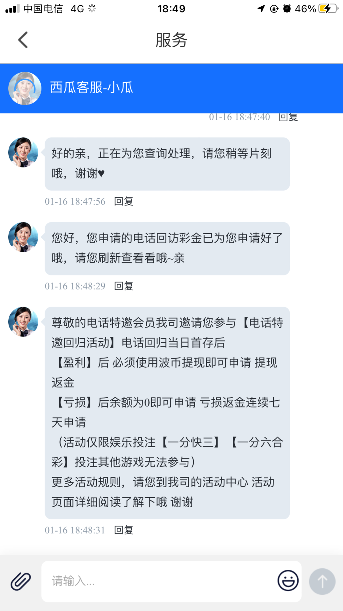 没接到电话 直接找客服说你们刚刚打电话来说送彩金 然后送了38 没打出来 有号的去碰瓷吧 能不能碰到看脸 我没打出来 别喷
