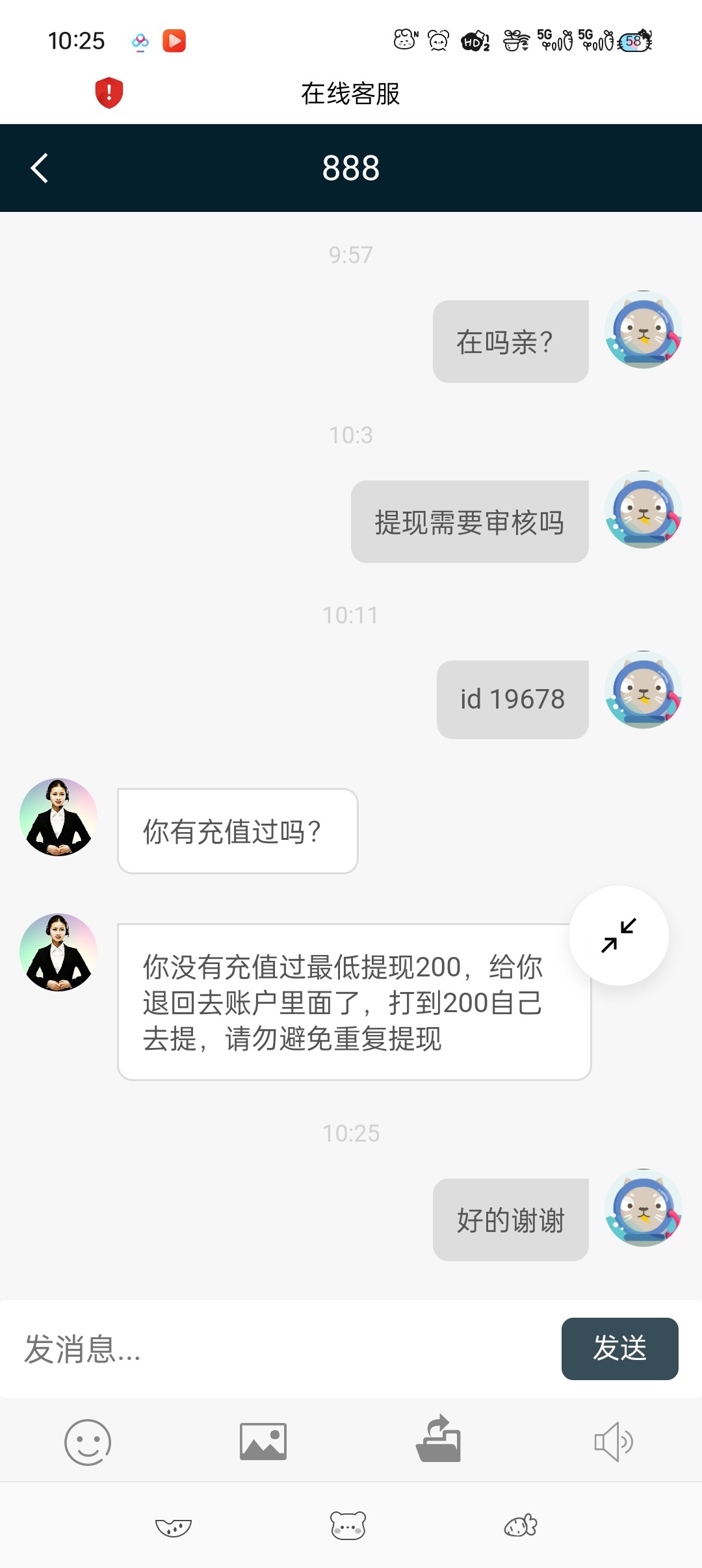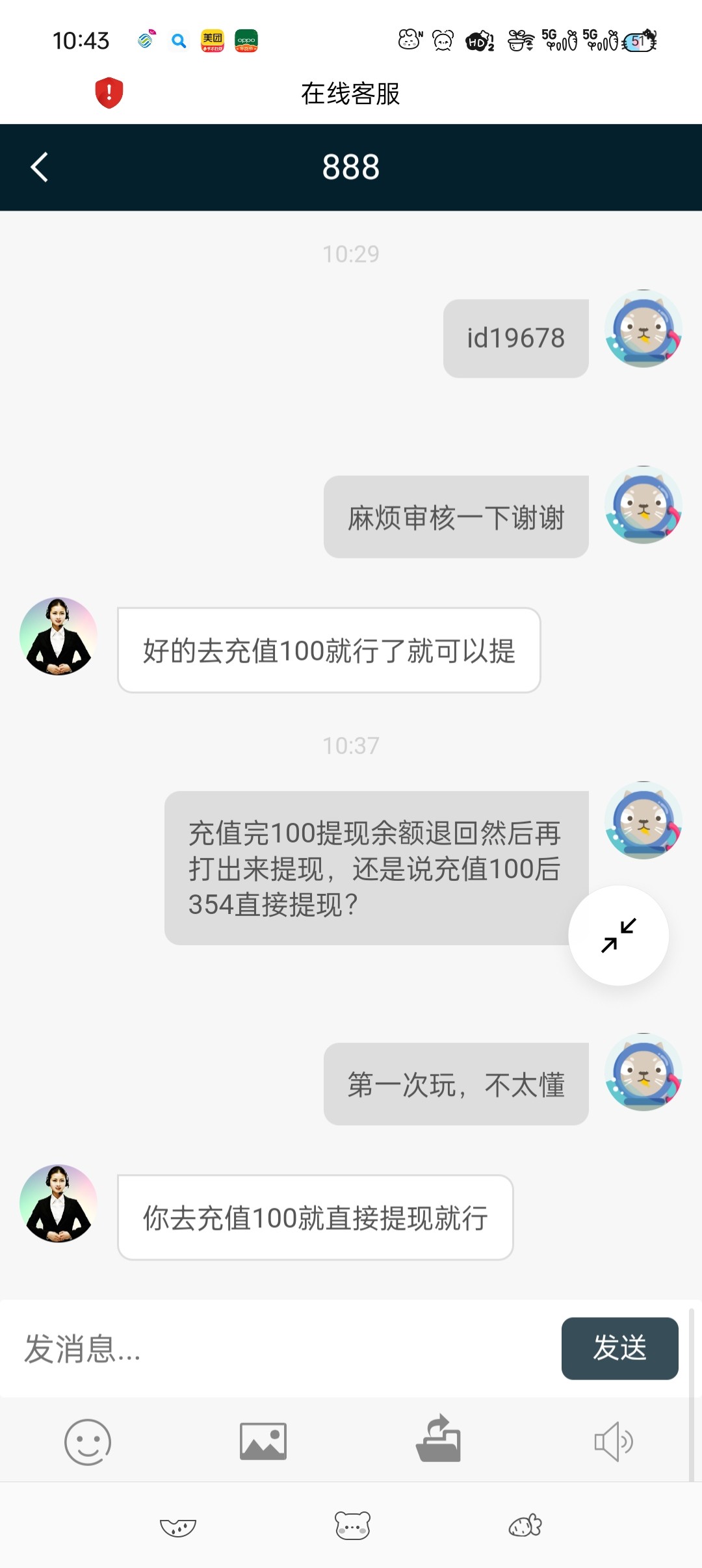 注册送了9,打到127提现,被退回,客服说没充值过只能到200提现。打到354又说充值100才能提,有出过款的老哥吗?我怎么觉得是套路台,鞥能充值吗?