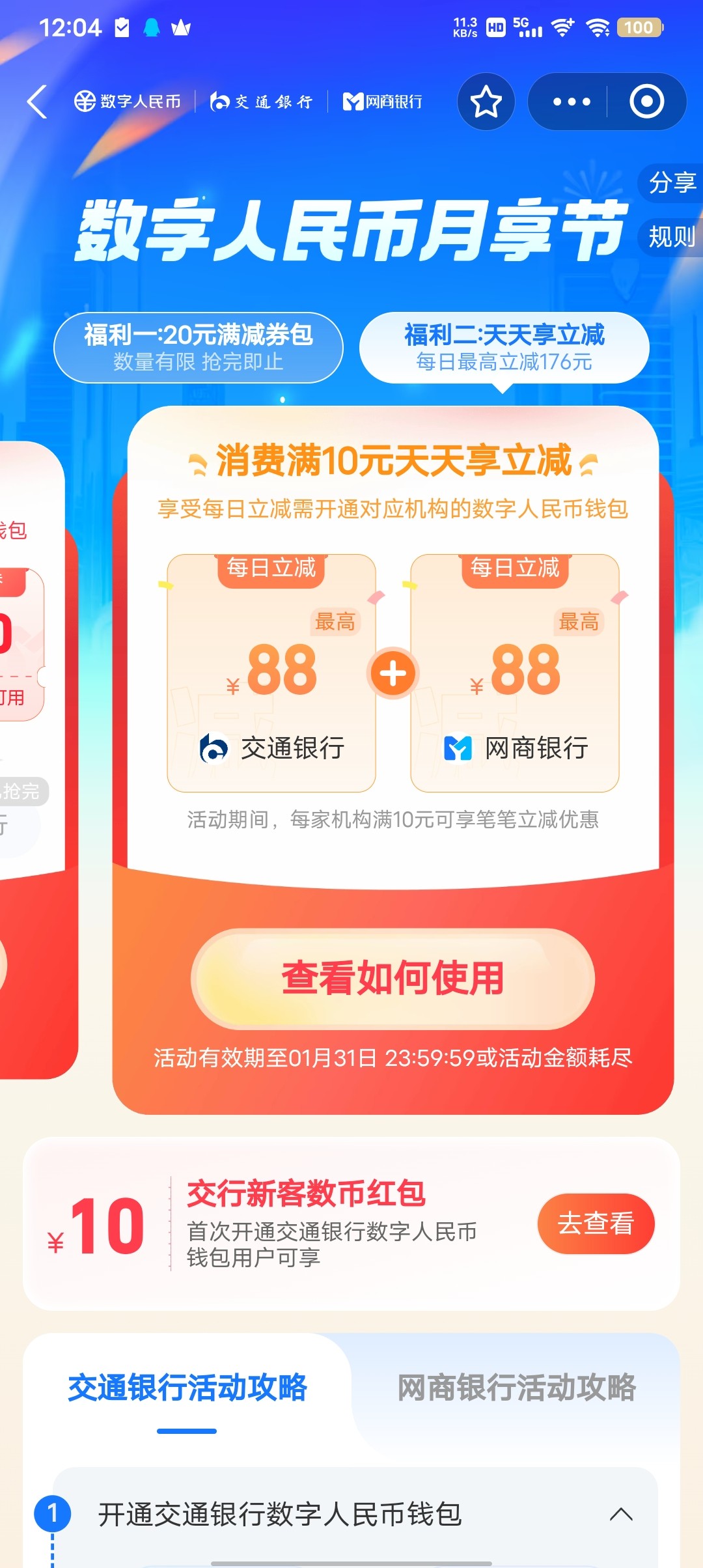 支付宝搜索数币月享节进入,开通交通银行数字人民币,领10元红包