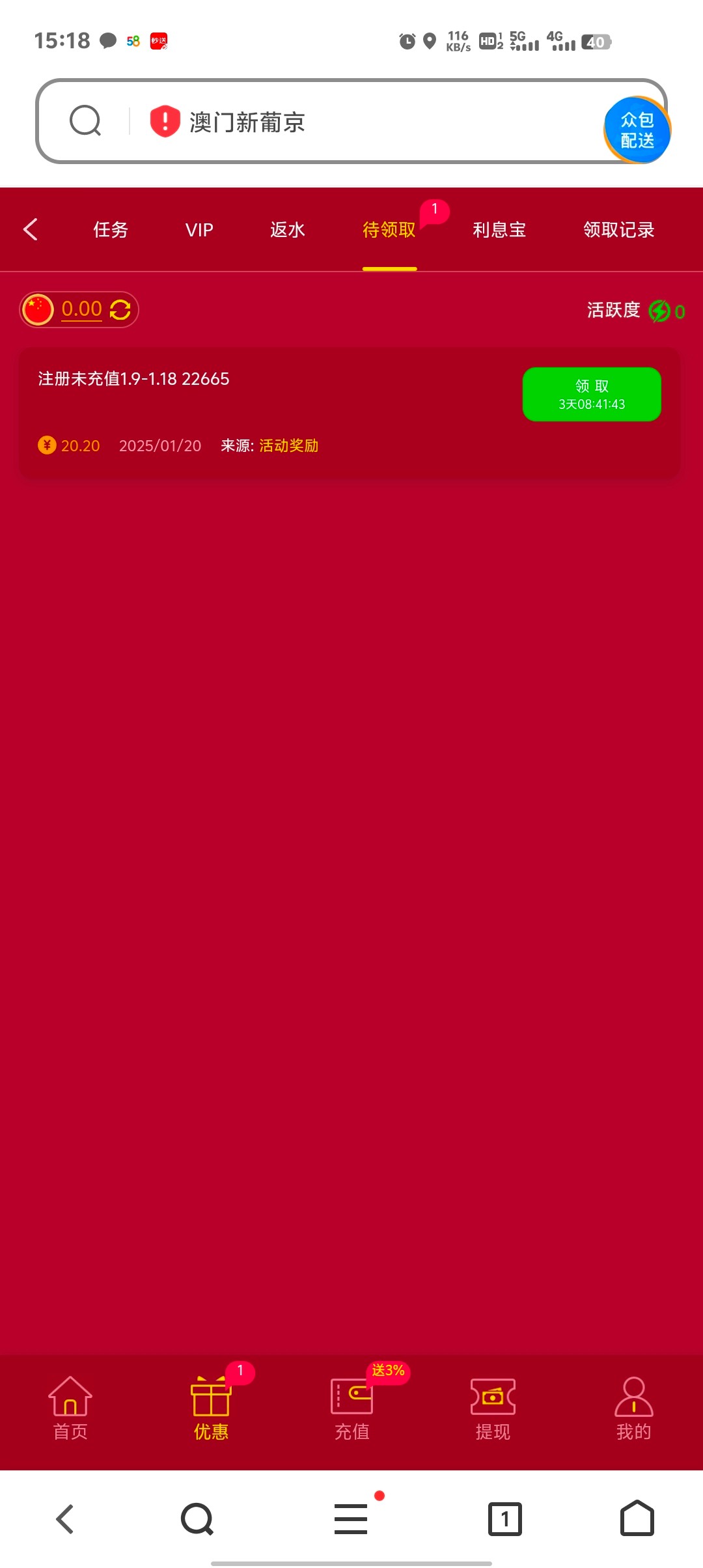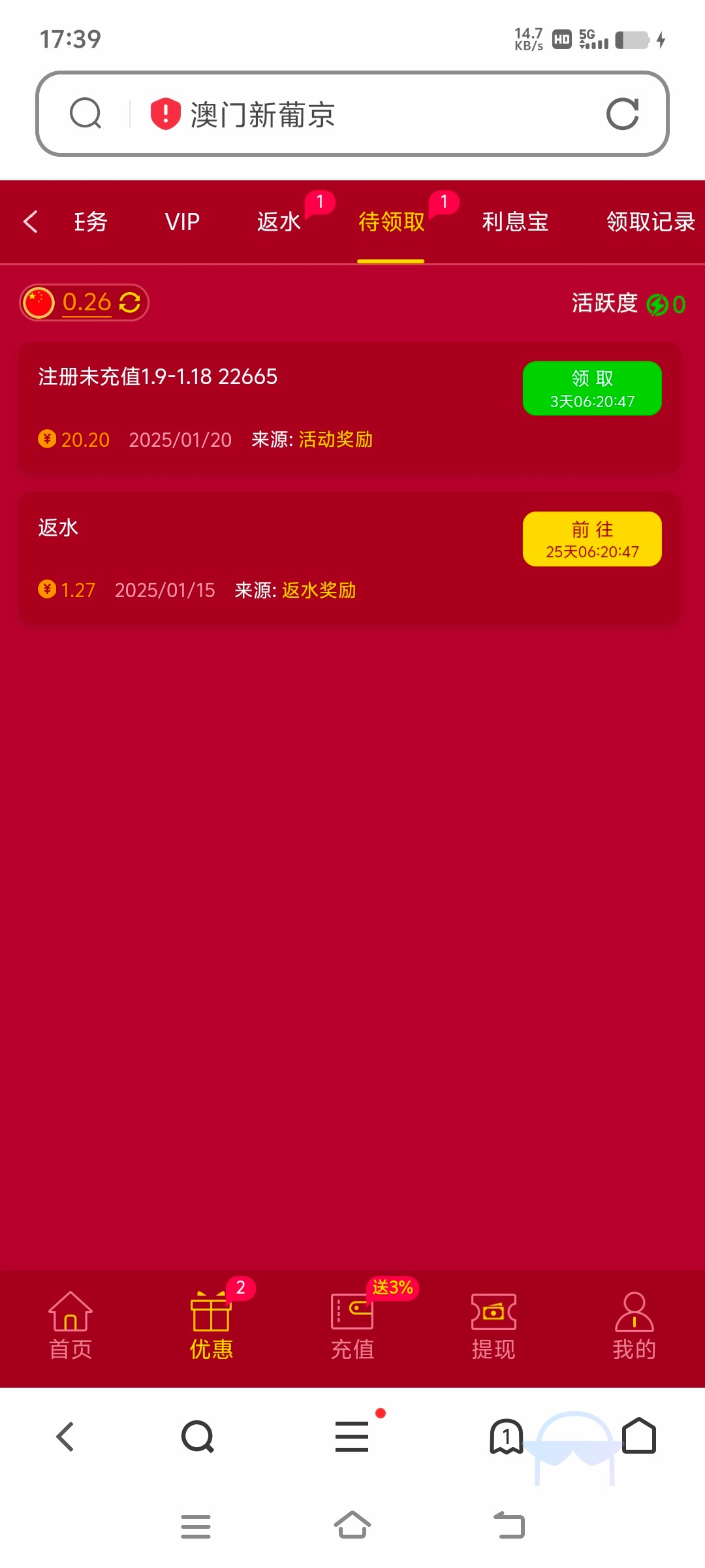 之前注册202,没有充值过的有回馈彩金20块,1.9号到1.18注册未充值的,这段注册过的老哥可以上号看看,我刚领到20,我是客服打电话来,直接到福利中心的