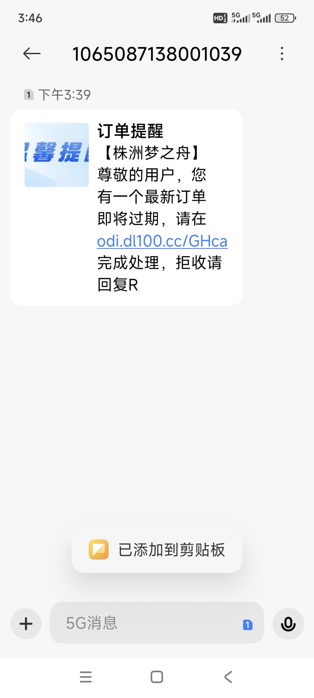订单提醒【株洲梦之舟】尊敬的用户,您有一个最新订单即将过期,请在 odi.dl100.cc/GHca 完成处理,拒收请回复R