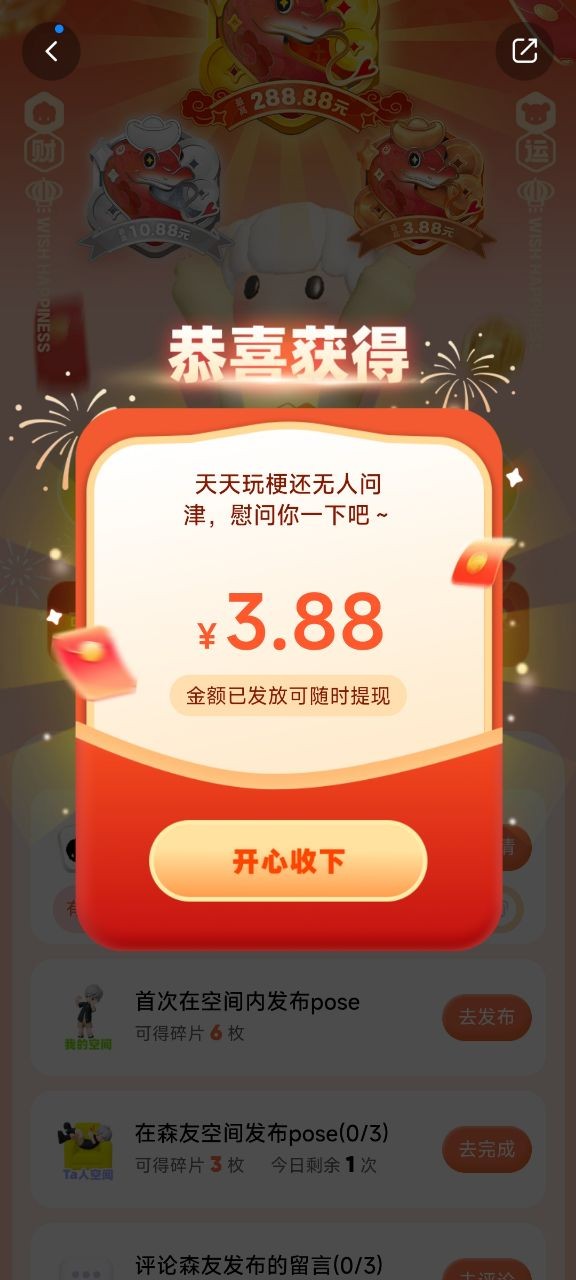 应用商店搜森森下载,看图片完成任务,消耗6个能抽一次,第一次3.88,后面全是0.88,几分钟就能完成
