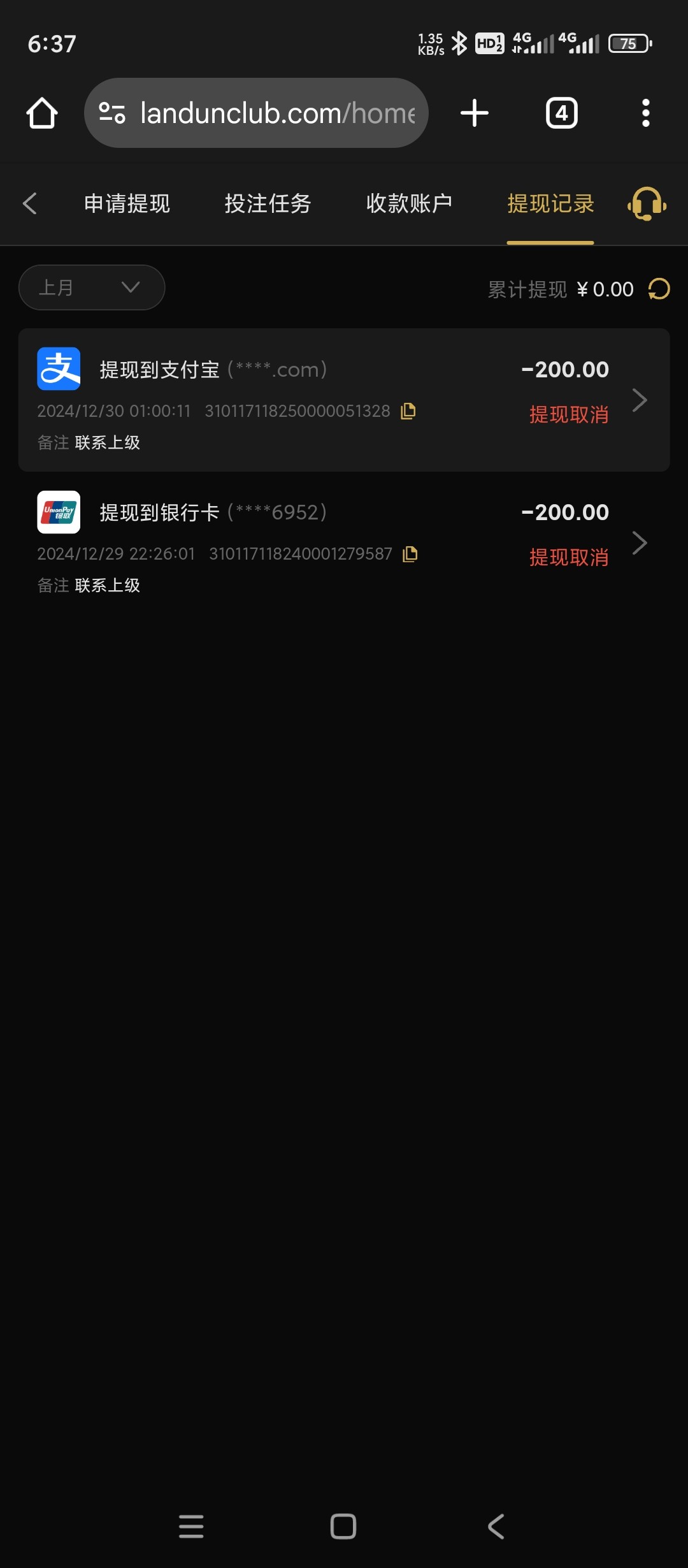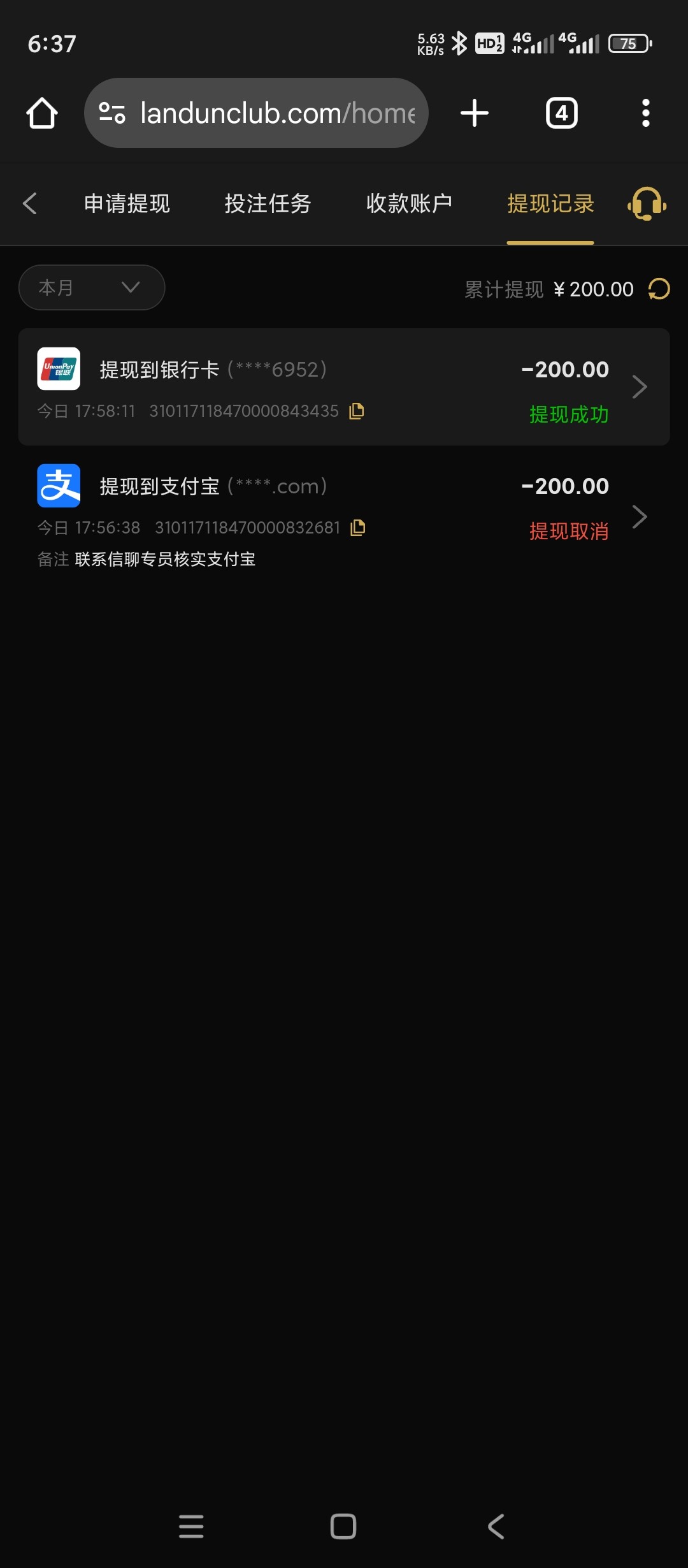 上号发现有50打上200,提现居然到了,上个月上号领了58打上200提现让我上级,联系不了一点好吧,之前玩4+4提现2000给我到账4000,这次提现200居然给了这次的50也不知道哪来的,也没记录有号的可以上号有没有彩金(你们不要充值充值包呗黑的,我只是分享我的经历省的说我狗托,白嫖项目是让你们充值的吗?)