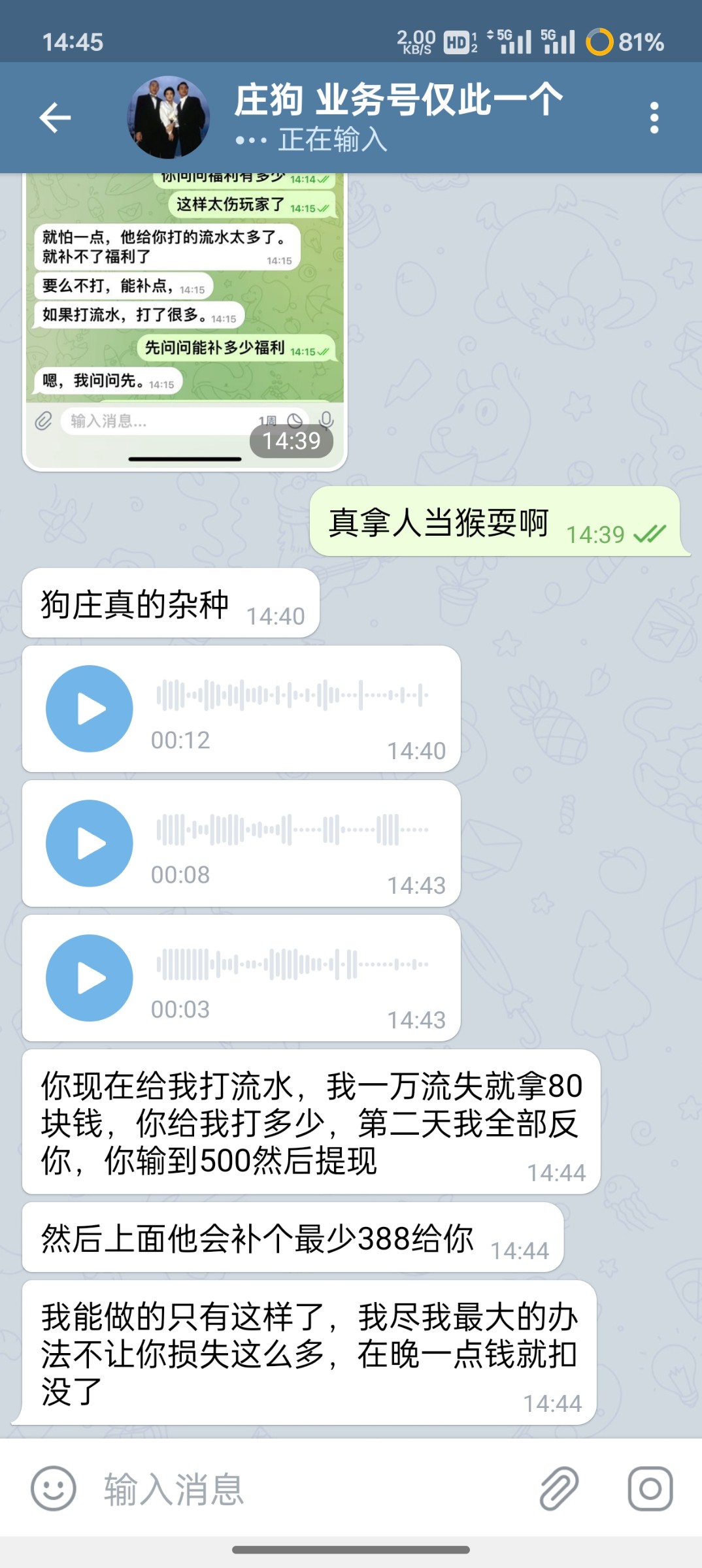 哈哈,这是你吧,我以为你赢了我也去打,1000+300说本彩6水,等我打了8000流水了告诉我流水按0.35算,一共要打24000流水,我直接草他妈