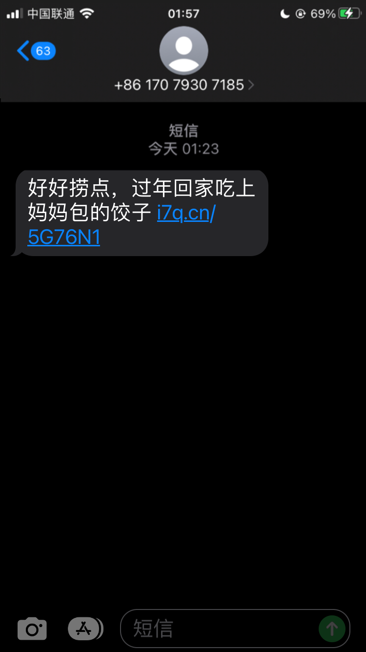 来短信了 还没有撸过的试试 撸过的无视就行可以去碰一碰 打电话让注册送 不知道黑不黑好好捞点,过年回家吃上妈妈包的饺子