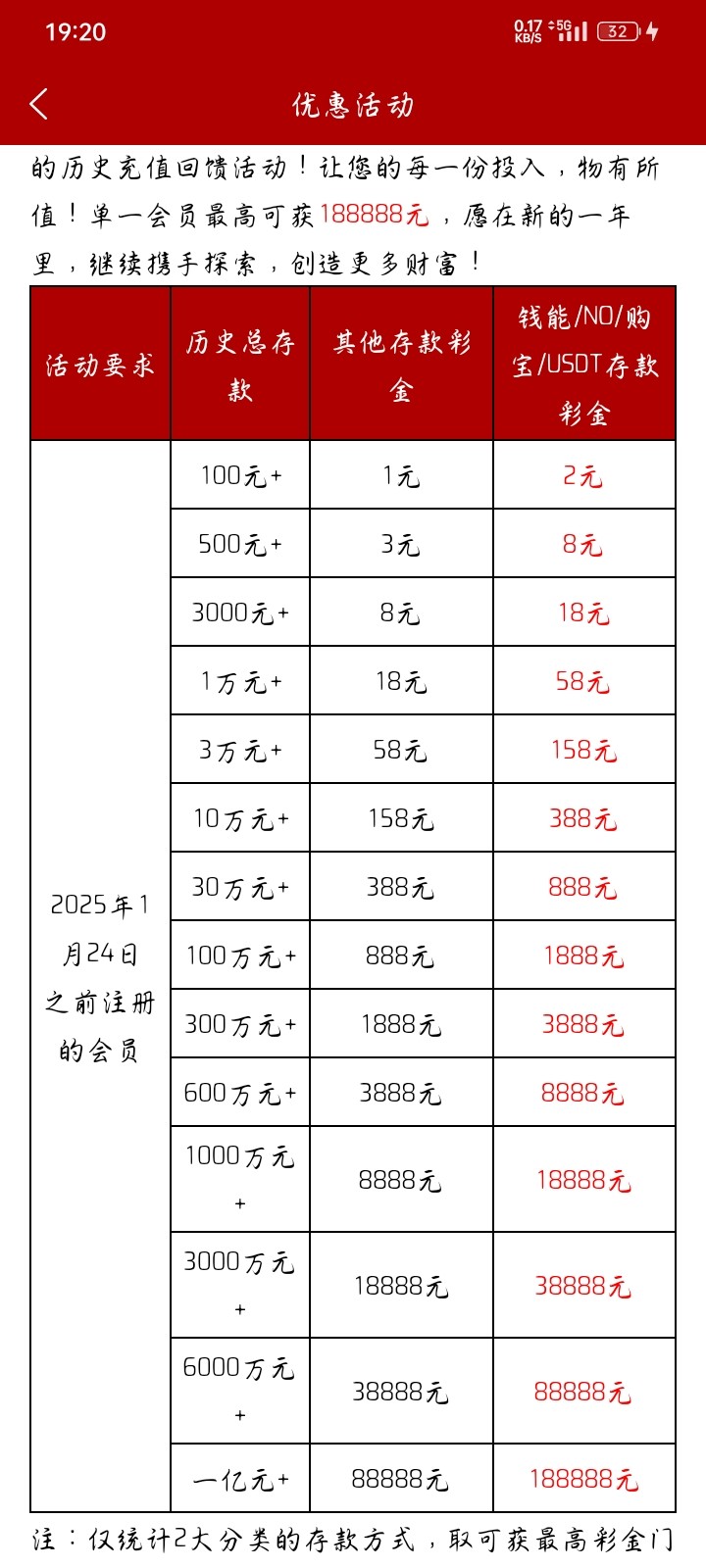 我突然发现,我历史总存款能领的彩金比历史单笔要多很多,哈哈哈。我一共3个号,以前怕被黑,钱能存款最高单笔也就1000存一次,如果是单笔活动我每个号最多领118。但是现在我去查了3个号的总存款,一个3.8w,一个26w,一个160w。牛逼了。160w那个号我也没想到会有那么多,仔细想想应该是前两年钱能每日存提款回馈还没有需要4倍流水第二天送回馈那个活动刷彩金时存的。