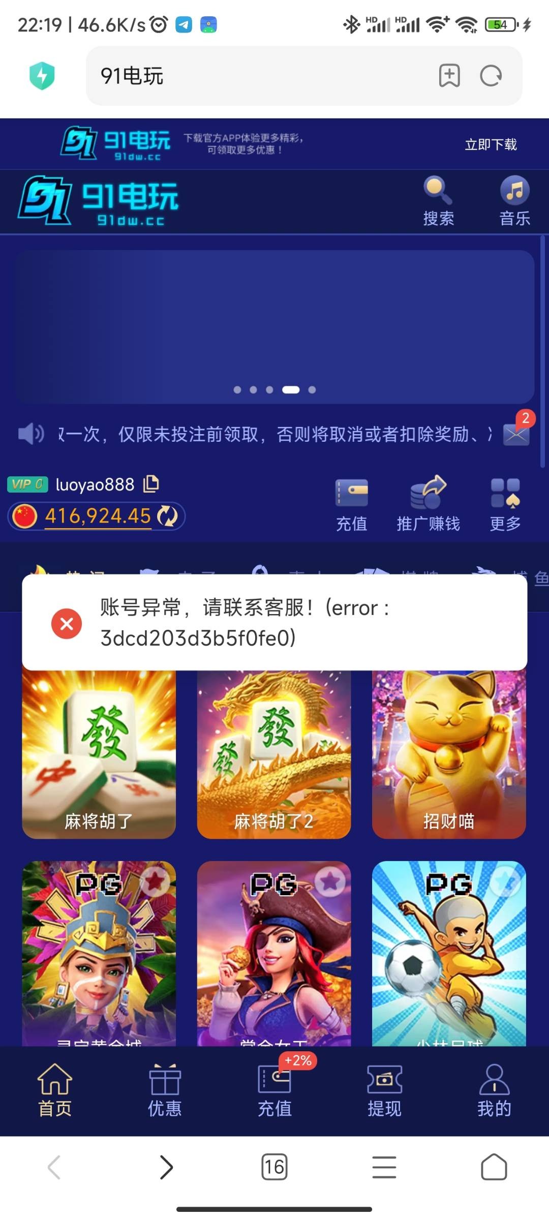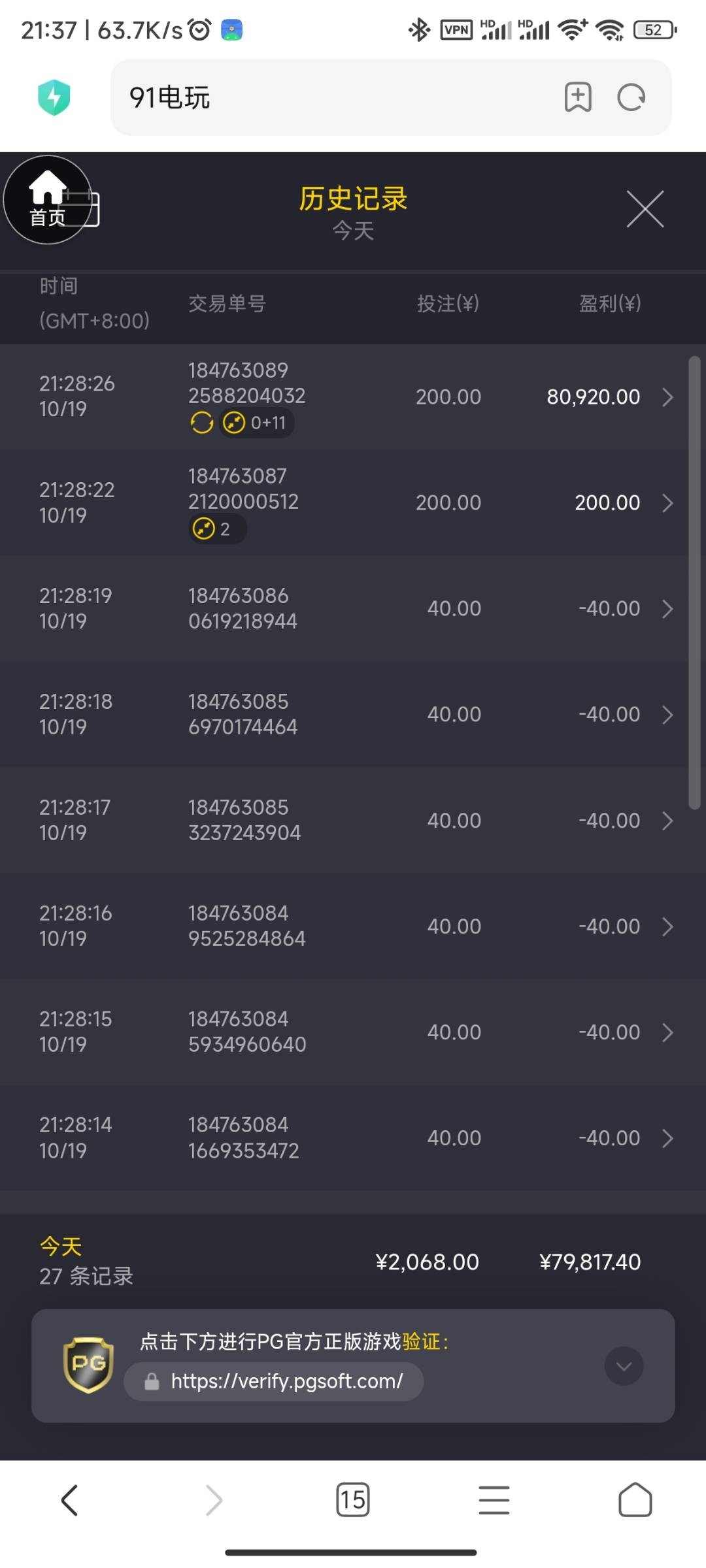 很久以前玩的91电玩,5000上41万直接黑了最开始玩的赏金大对决,拉到后面没耐心了200一拉两下就进去了,爆了8万多,然后去玩捕鱼,8万都打了好几万,然后爆了30w,又去玩麻将,最后盈利41万,然后账号直接异常