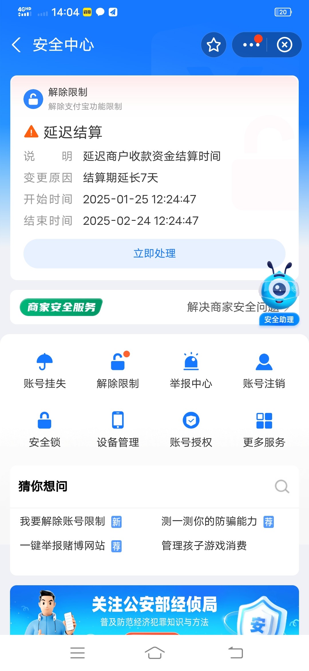 延迟结算你等不就好了,不要用商家收款码收款,他能做的,你也能做,百度一下,去外面拍个商家门头,以后不要用商家码收款,定位关掉