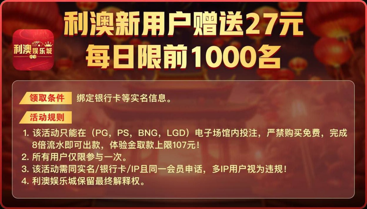新用户注册绑定银行卡信息直接秒每日前1000名送27彩金,限制电子不能买免费8倍流水提现。
