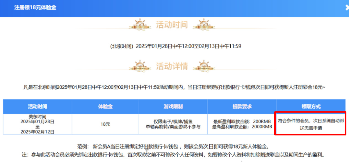 您好,【金蛇献瑞  注册体验金活动】活动期间内,若您满足了活动要求,次日系统会自动派发彩金,无需申请哦,谢谢~