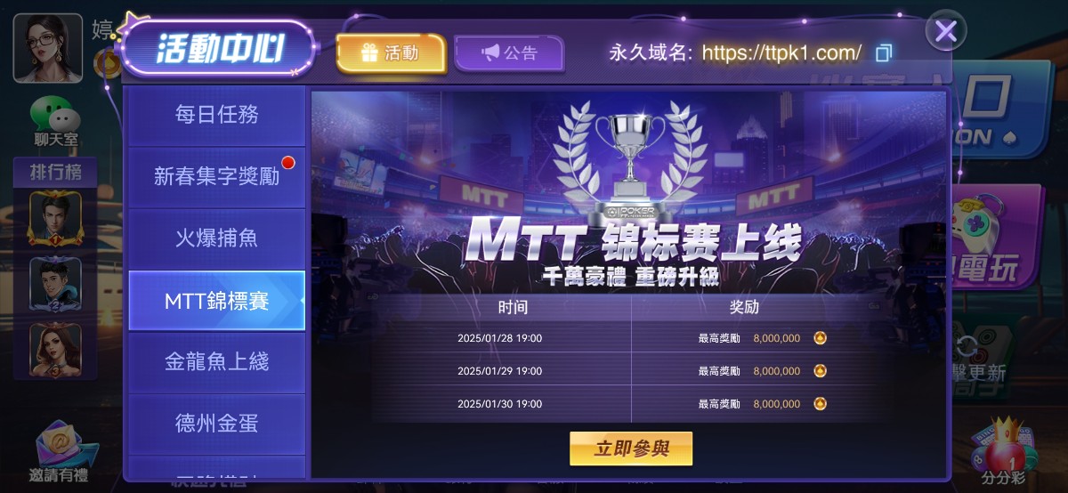 以前的一个老游戏工会制,我回归给了888万金币,最以前打德州的,我已经说好了兄弟们去都会给金币体验游戏,希望兄弟们红,共赢,并且每天都有免费德州比赛奖金800万金币(400米),兄弟们冲,记得加丝瓜客服 :huojian123或者 huojian234 最好第二个客服一定要备注 和天下推荐